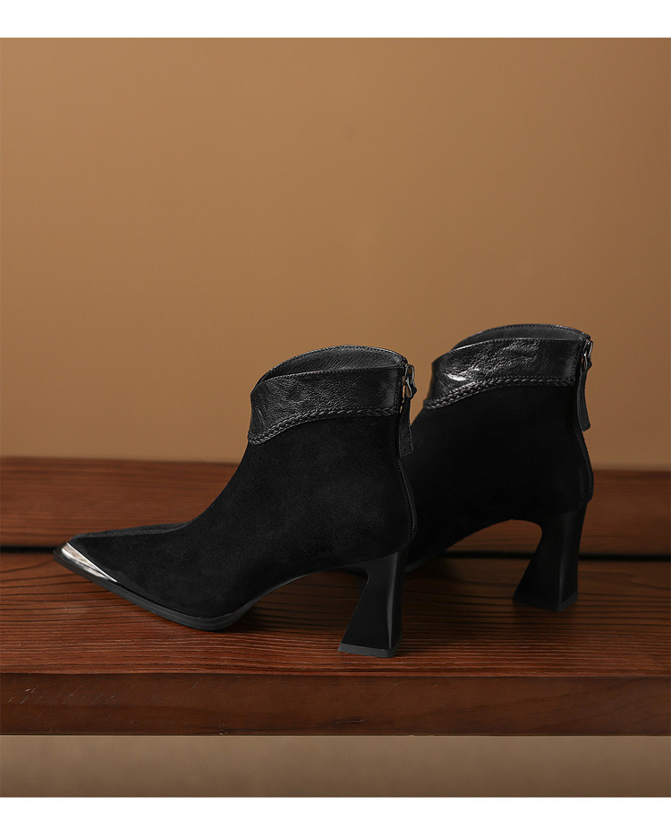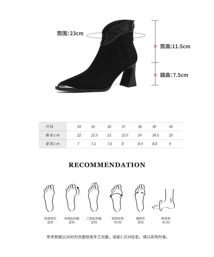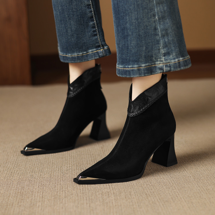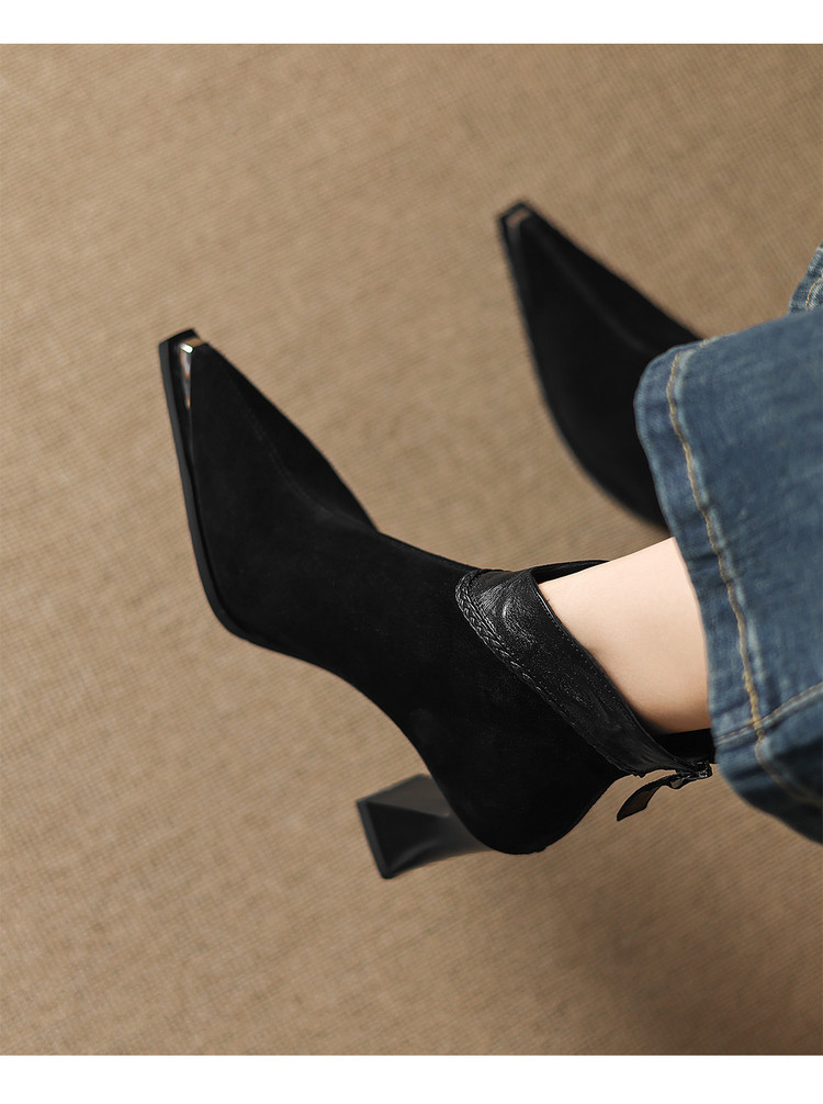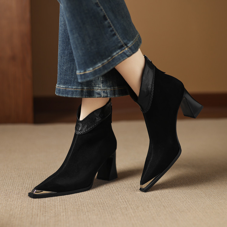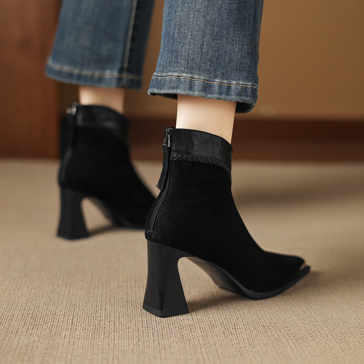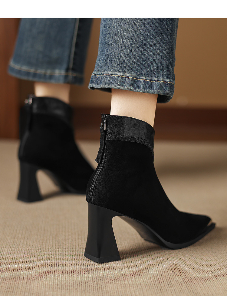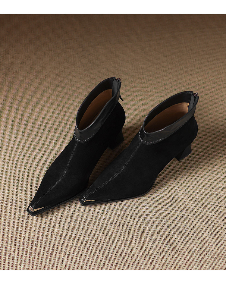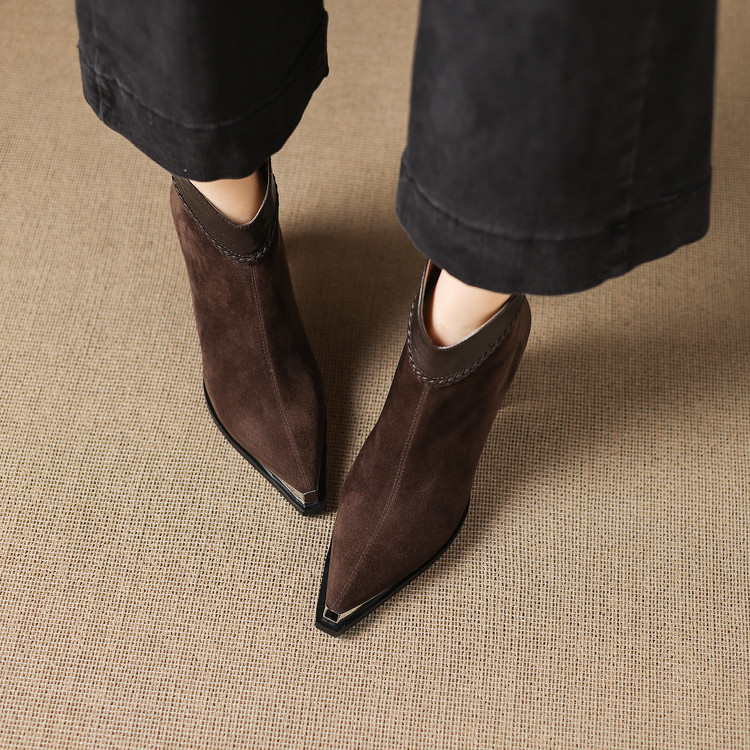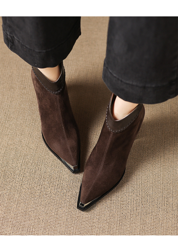 【预售5天】法式短靴女粗跟秋冬后拉链棕色气质高跟马丁靴显瘦V口瘦瘦靴DPJ&7178