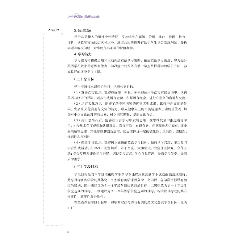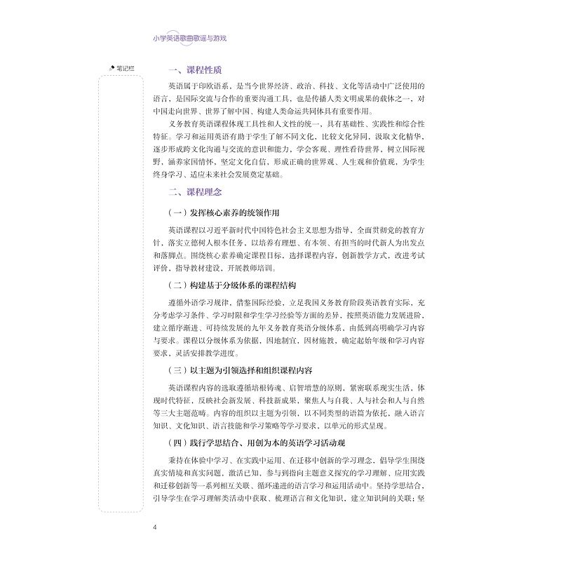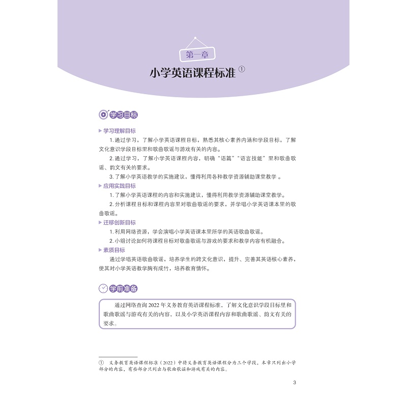 本教材编写的核心理念是培养应用型人才,主要根据2022年版《义务教育英语课程标准》进行编写。本教材共分为上篇、中篇和下篇三部分。上篇围绕理论知识进行,主要介绍小学英语课程标准、歌曲歌谣法和游戏教学法等。中篇主要为歌曲歌谣,依据小学英语课本《英语》(闽教版,2018年),对课本里每一个单元的教学重点进行歌曲歌谣设计;下篇为游戏部分,主要对课本里每一个单元的教学重点进行游戏设计,每个单元配套有两首歌和两个游戏,共编撰有256首/个歌曲与游戏,整体指向英语语篇和英语语言技能要求,旨在全面提升师范生的整体英语教学水平。