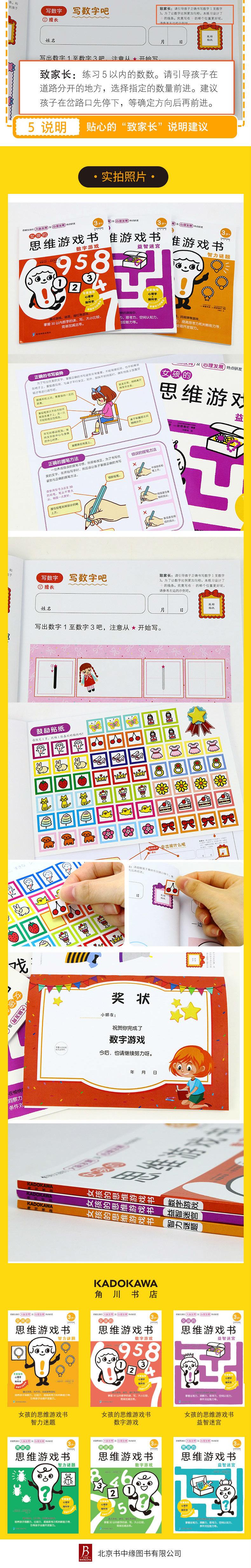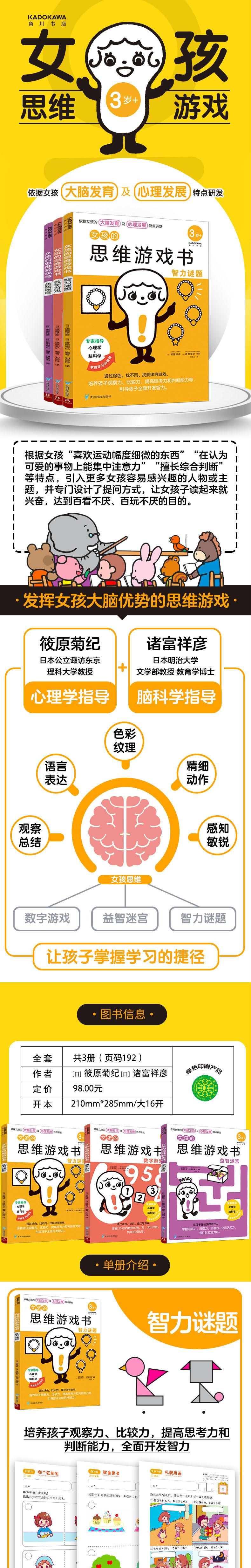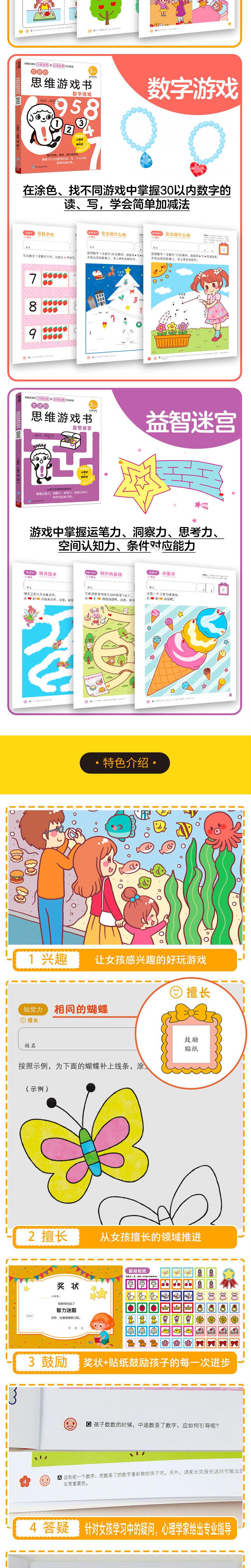 《女孩的思维游戏书》依据女孩“大脑发育”和“心理发展”特点研发,可以让孩子充分发挥自己的大脑优势。书中利用女孩“擅长综合判断”“善于区分颜色”等特点,精心设计了很多女孩擅长的题目,让她们能充满兴趣地完成整本书的练习。此外,对于女孩不擅长的领域,则通过添加她们感兴趣的元素,如“公主”“蛋糕”“童话世界”等,提升孩子兴趣,用“喜欢”填补“不擅长”。每套书分智力谜题、数字游戏和益智迷宫3册。书中通过引入女孩感兴趣的主题,让孩子保持学习的积极性。智力谜题:通过连线、涂色、找不同、找规律等游戏性的练习与复习,培养孩子对图片的观察力、感知力、比较力、思考力、推理力,以及洞察力、认知力、分类能力、理解能力和判断能力,引导孩子开发智力。数字游戏:通过连线、迷宫、描红等游戏式设计,锻炼孩子数字读写能力、认识数序、比较大小、数字分解、数字合成等能力,帮助孩子熟练掌握数字1-30。益智迷宫:通过变化丰富的迷宫,如道路迷宫、人物迷宫、方格迷宫、立体迷宫、数字迷宫等,让孩子在愉快的游戏中,掌握运笔力、洞察力、思考力、空间认知能力、条件对应能力等。