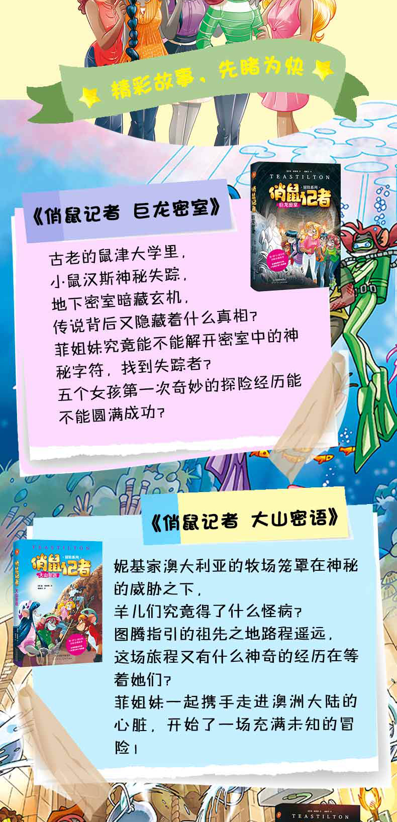 开学季,五姐妹探险之路开启! 古老的鼠津大学里, 小鼠汉斯神秘失踪, 地下密室暗藏玄机, 传说背后又隐藏着什么真相? 菲姐妹究竟能不能解开密室中的神秘字符,找到失踪者? 五个女孩 次奇妙的探险经历能不能圆满成功? 妮基家澳大利亚的牡场笼罩在神秘的威胁之下, 羊儿们究竟得了什么怪病? 图腾指引的祖先之地路程遥远, 这场旅程又有什么神奇的经历在等着她们? 菲姐妹一起携手走进澳洲大陆的心脏,开始了一场充满未知的冒险! 宝琳娜收到了妹妹玛丽亚的电话, 匡特察察教授的儿子——考古学家贡萨洛在秘鲁失踪了! 未知的秘密古城、未知的古代文明、未知的巨大宝藏…… 菲姐妹能帮助匡特察察教授找回失踪的儿子吗? 她们能找到埋藏千年的秘密古城中的宝藏吗? 快来跟菲姐妹一起探险吧! 朱莉毕业作品被偷走的背后究竟隐藏着什么秘密? 菲姐妹步步紧追,小偷却逃向了巴黎歌剧院! 为什么神秘小偷的身份令人如此震惊? 那份毕业作品跟传闻中的密室究竟有什么关系? 真相即将浮出水面…… 伊恩教授潜入鲸鱼岛海底为什么神秘失踪? 失踪事件与传说中的“穆西女王号”有什么奇妙的联系? 五个女孩一起去中国,她们又发现了什么宝藏? 在贪婪的黑暗势力围追堵截下,她们又如何化险为夷? 快来跟随菲姐妹一起潜入奇幻海底、登上古老长城!