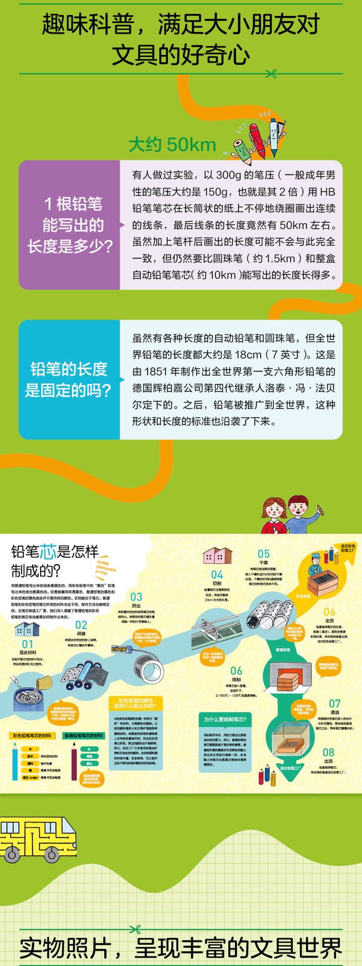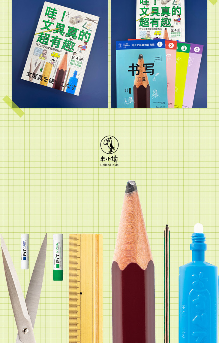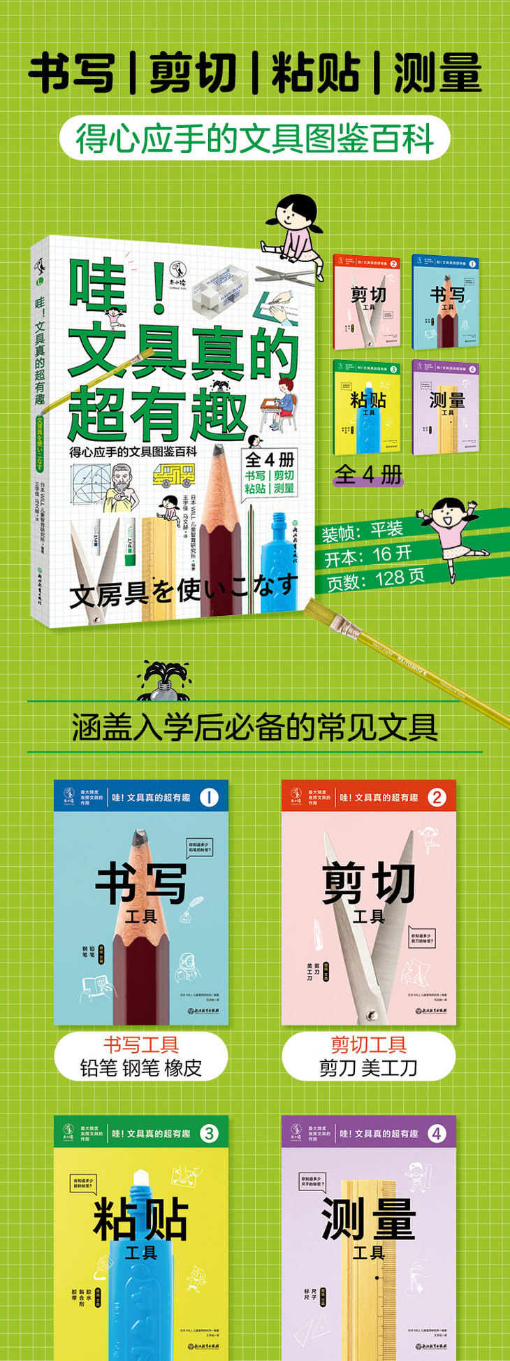 本书共4册,主题分别为书写工具、剪切工具、粘贴工具、测量工具,16开四色印刷。这套书将为你介绍各种文具的种类、历史起源、发展过程、正确使用方法以及特殊的使用技巧,特别适合中小学生。配以色彩丰富的插画和照片,让读者详细了解与所使用文具有关的一切,充分感受文具的魅力。