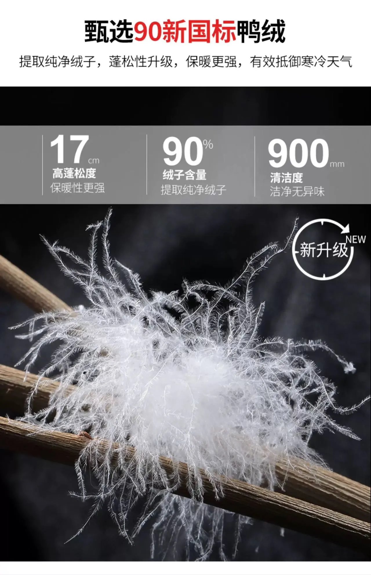 绒朵干净蓬松,清洁度高达900mm没异味。