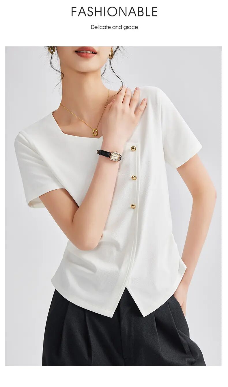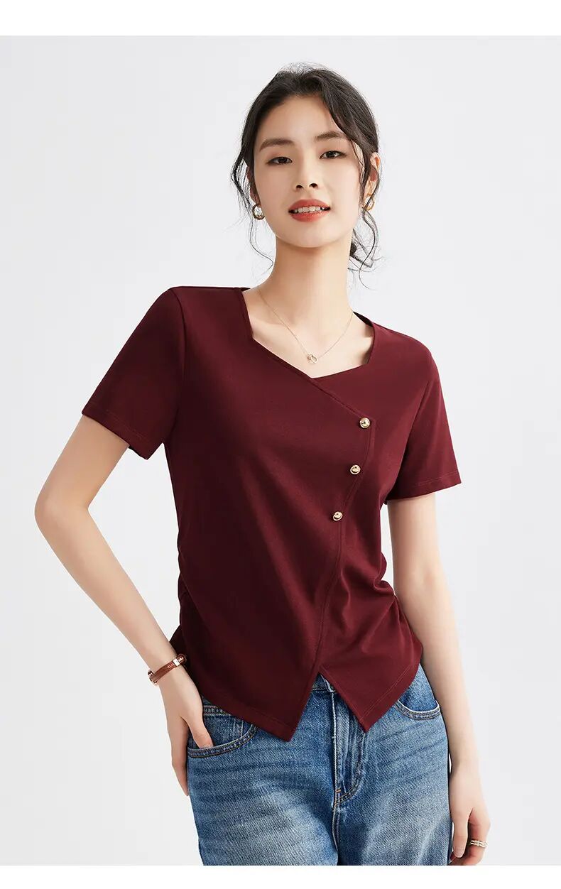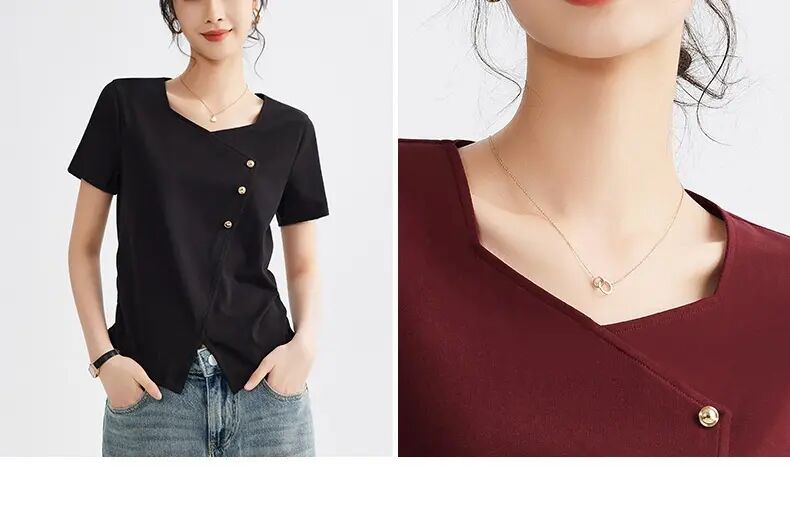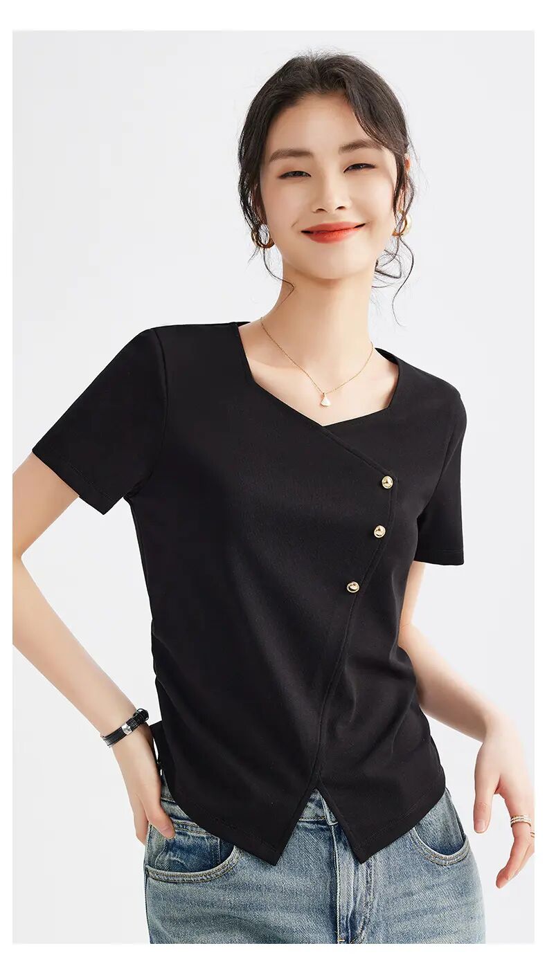 【自】全新升级【铂金会员100/天猫129/差价29】(01609) 洛诗琳正肩方领短袖t恤女夏季2025新款高端不规则半袖