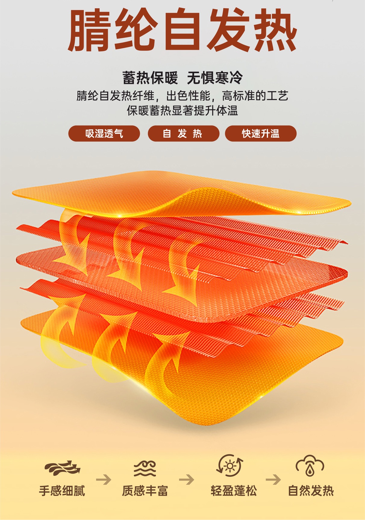 加绒带自发热纤维,实现远红外发热,轻盈锁温,可以锁住人体的热空气,使温度保持均衡,一直享受裸感的37°C!