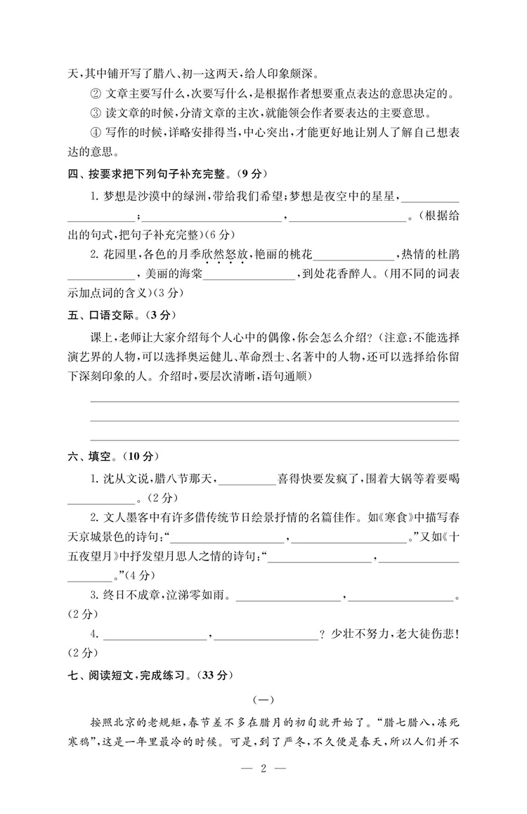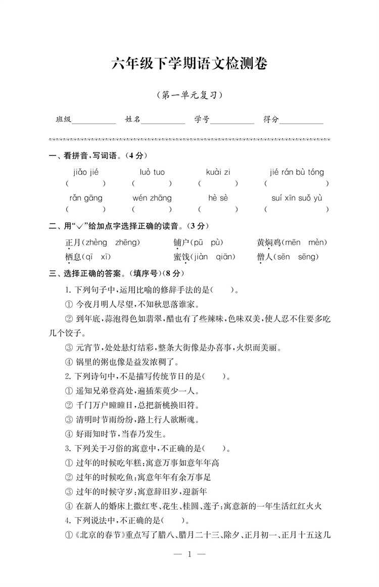 2025春 练习与测试检测卷小学语文六年级下册 同步人教版部编版语文课本使用 6下含电子答案 江苏凤凰教育出版社