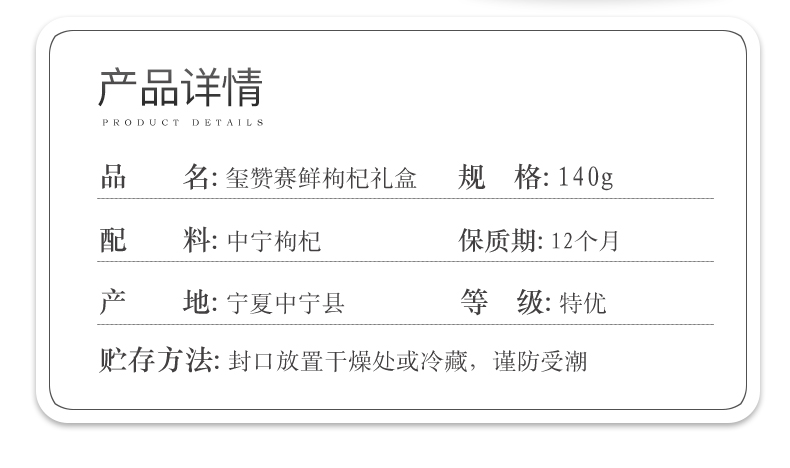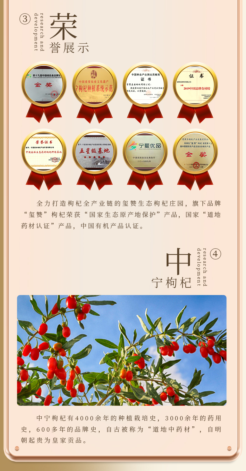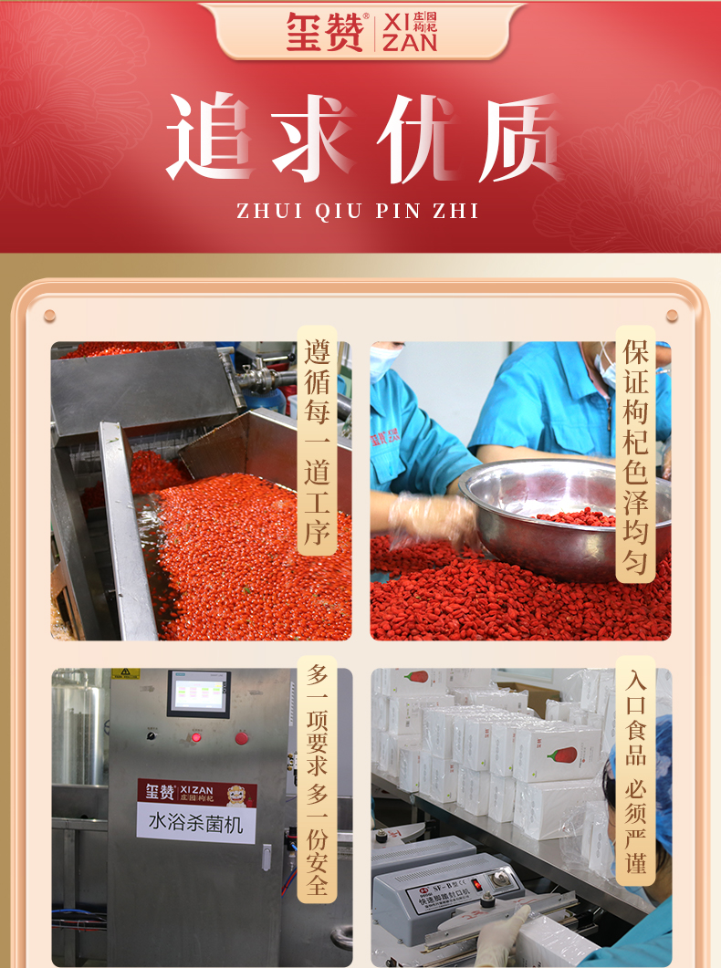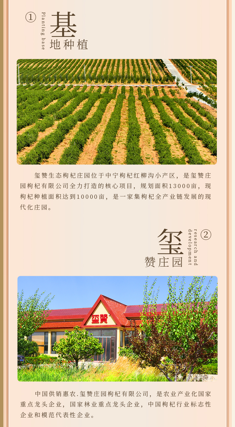 玺赞公司位于中国枸杞之乡—宁夏中宁县。在中宁枸杞红柳沟小产区建高标准枸杞种植基地一万三千亩—玺赞生态枸杞庄园,实现了研发、种植、加工、营销、文旅、生态“六位一体”的现代枸杞全产业链企业,本店是玺赞微店
