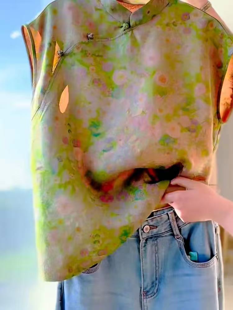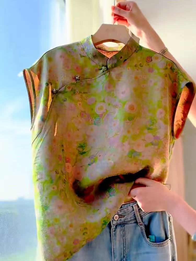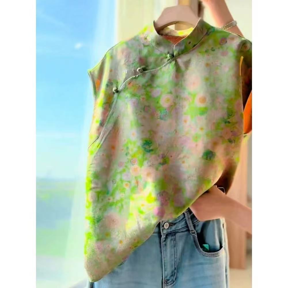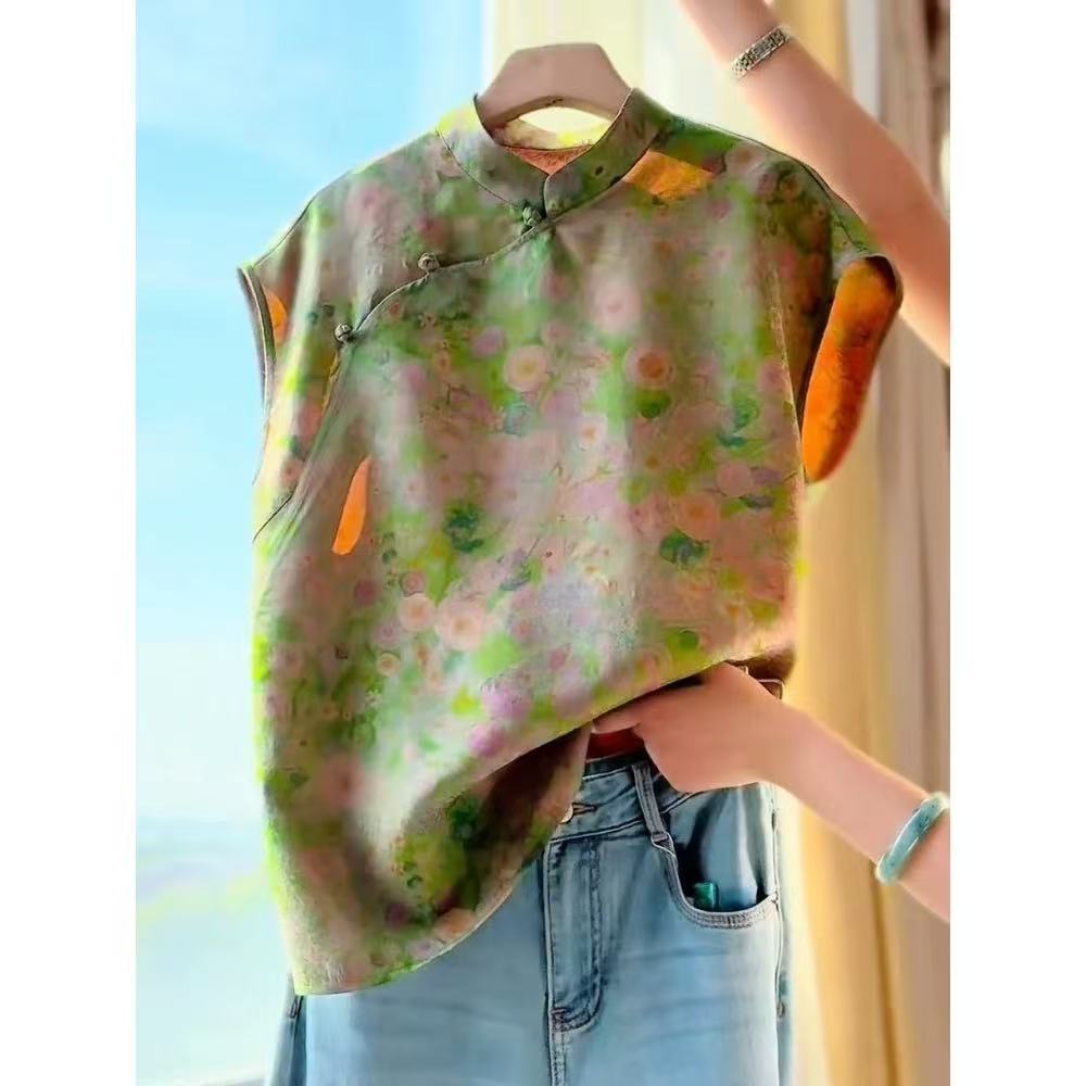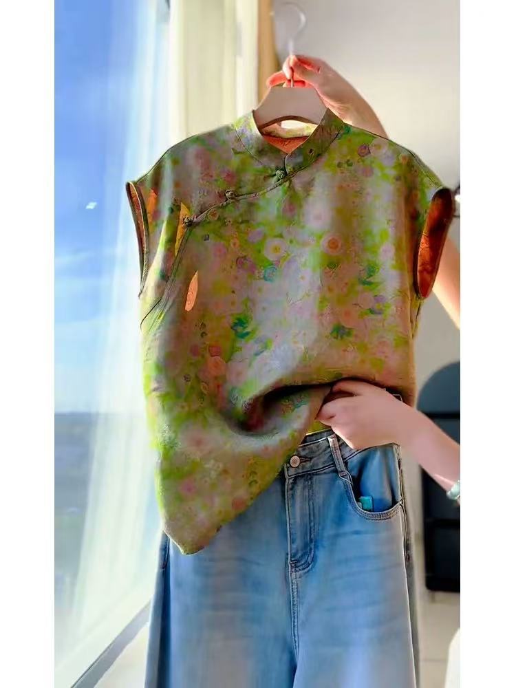 丁摩 新款新中式国风绿色提花旗袍小衫复古轻奢红罗上衣5ZF-066