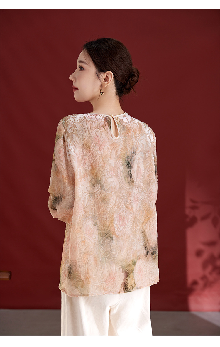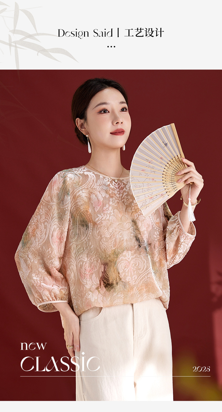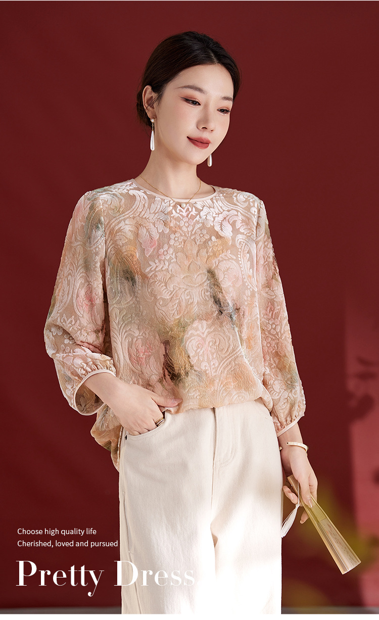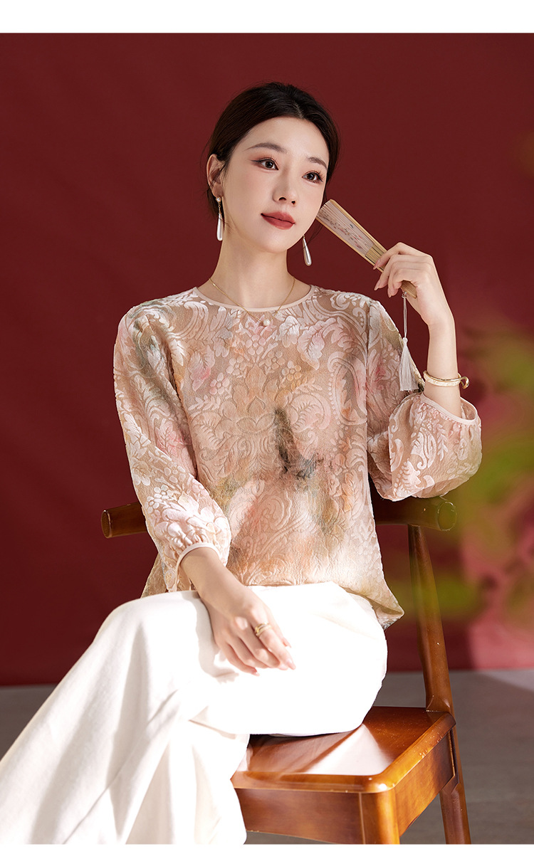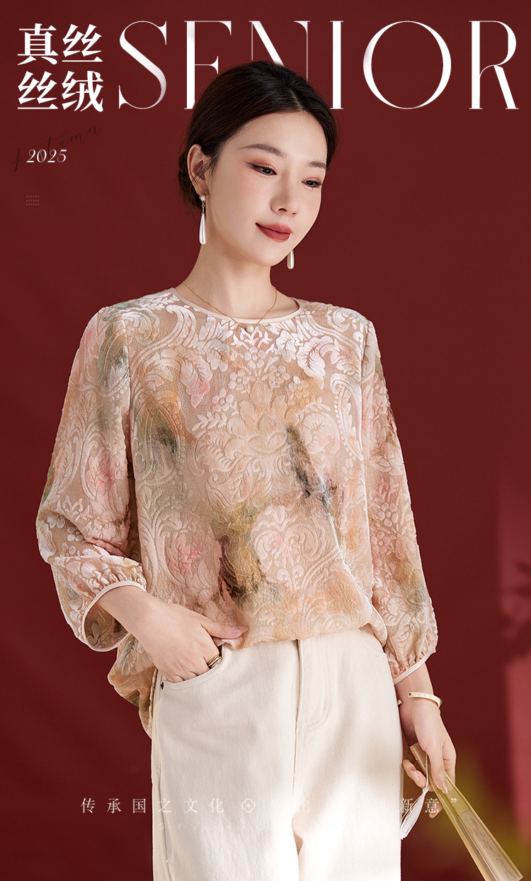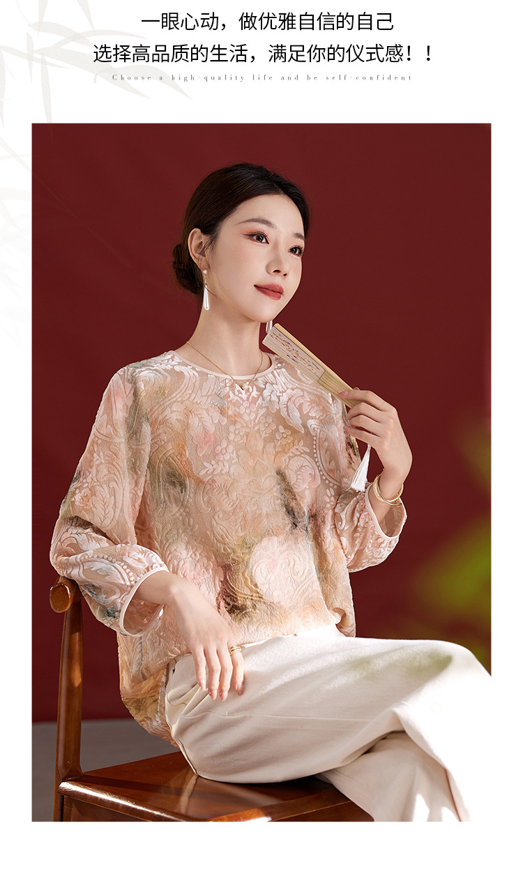 雀说新中式女款圆领真丝丝绒薄款T恤烧花慵懒风新款上衣AL1287