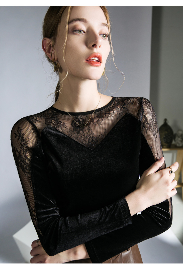 洋气设计感蕾丝上衣,拼接黑色丝绒性感T恤法式别致小衫XD-FN23TX1002