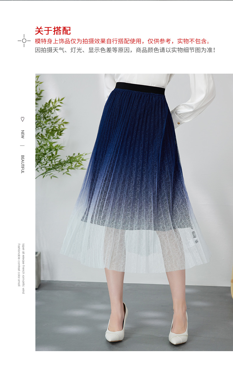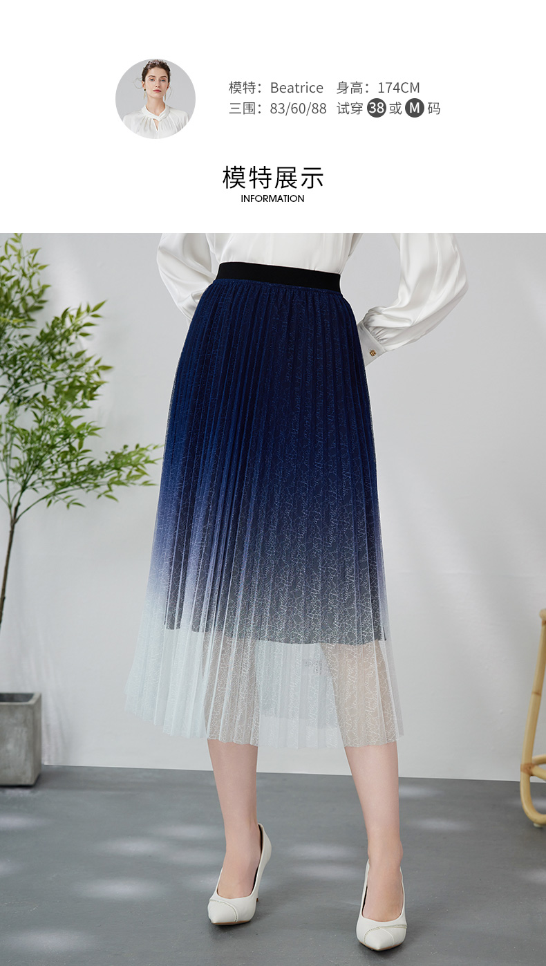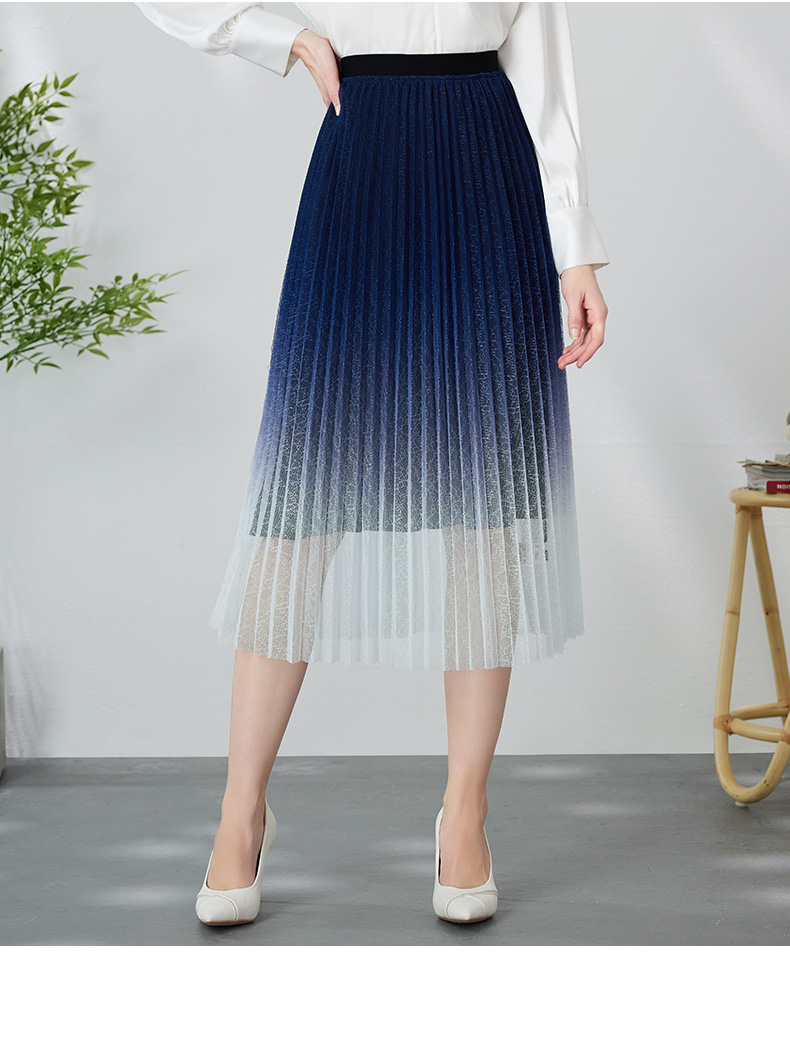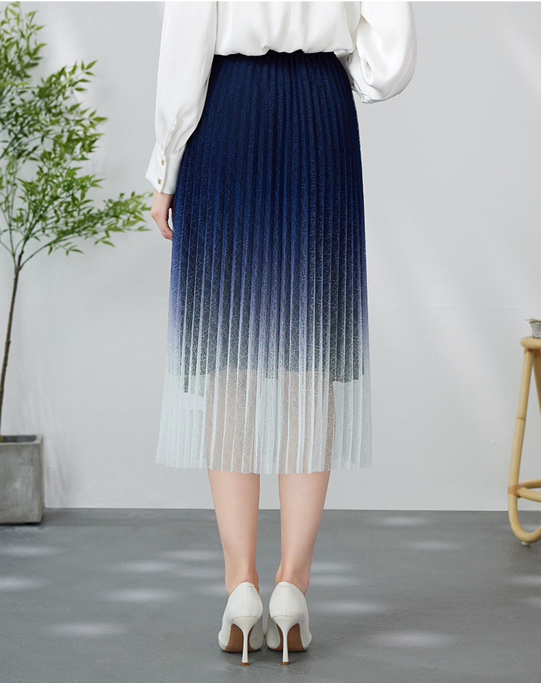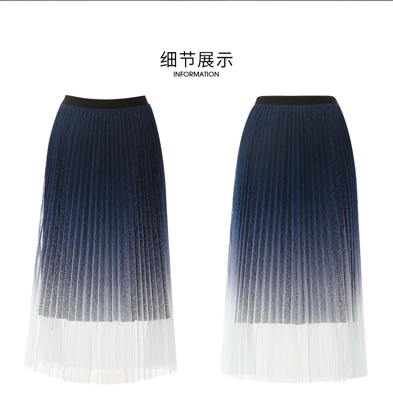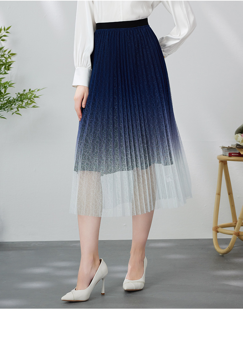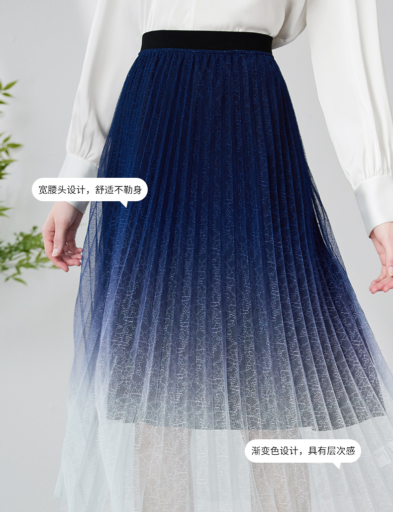 EITIE爱特爱时尚渐变网纱百褶高腰A字过膝蓝色半身裙春季新款A2406307