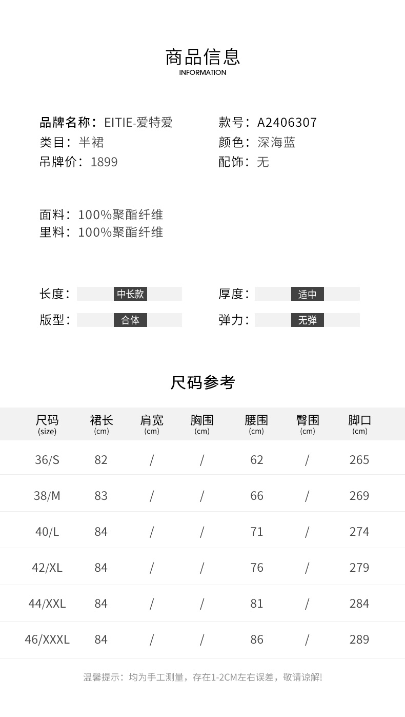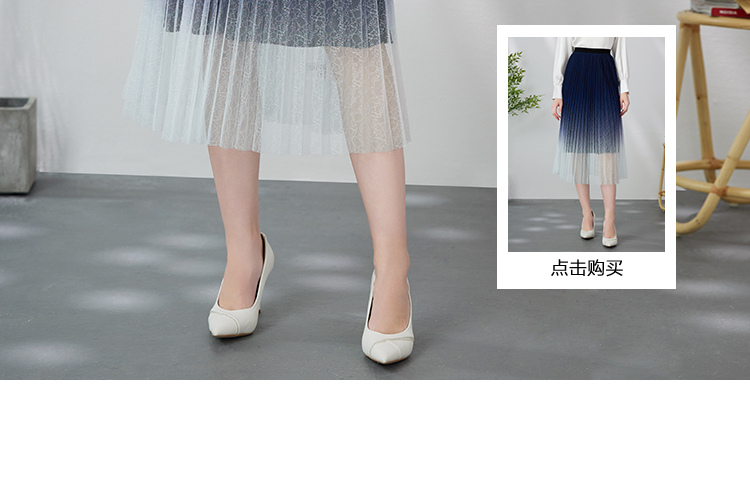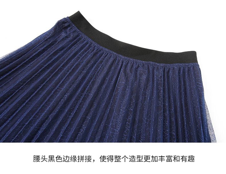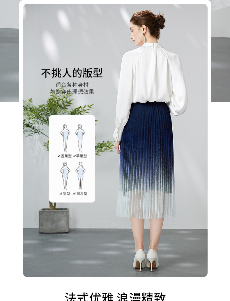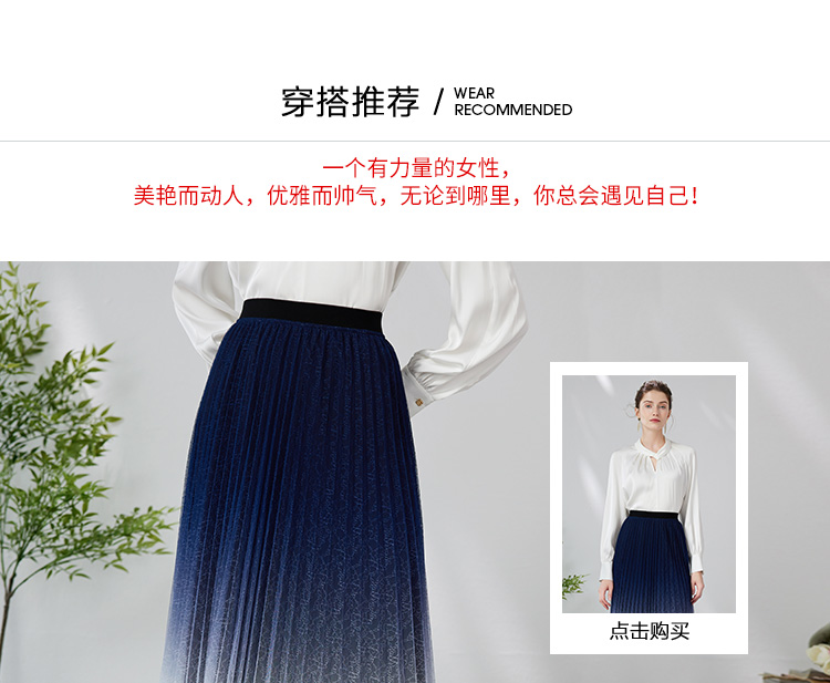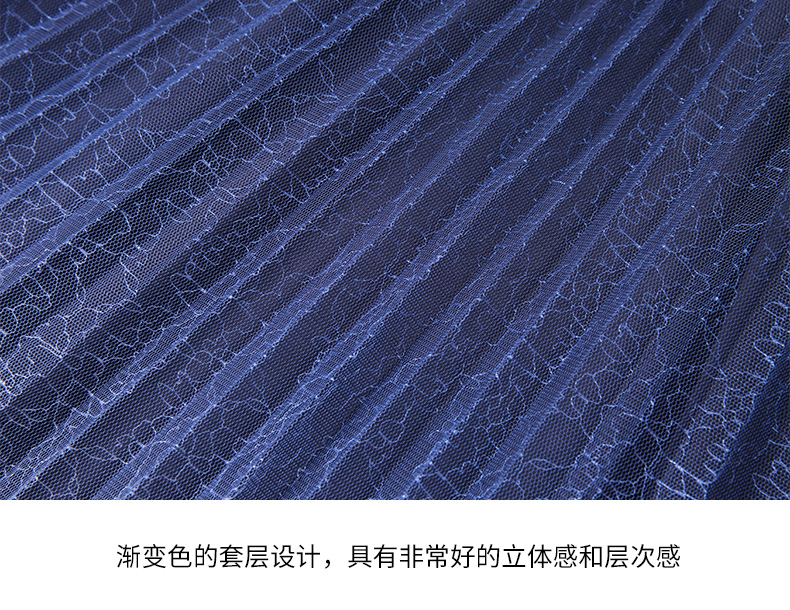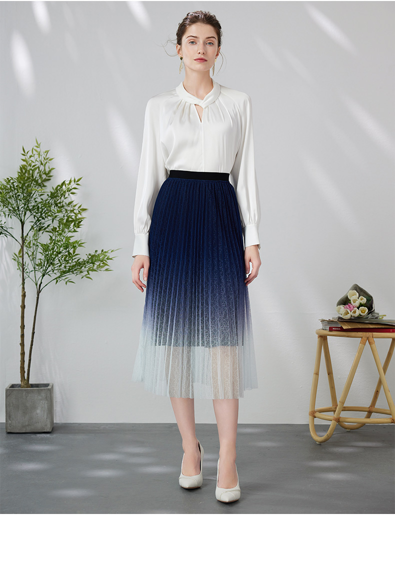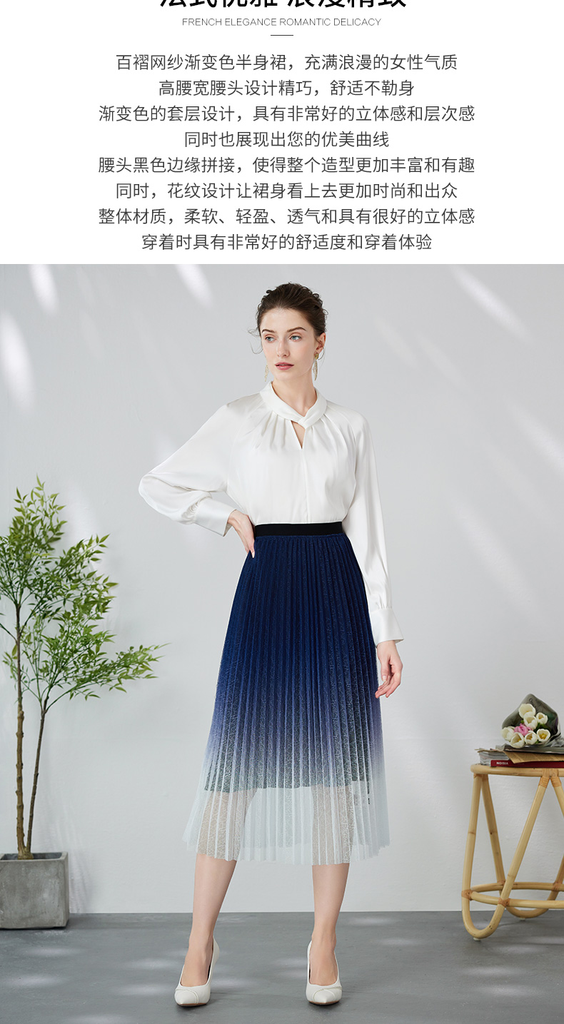 EITIE爱特爱时尚渐变网纱百褶高腰A字过膝蓝色半身裙春季新款A2406307