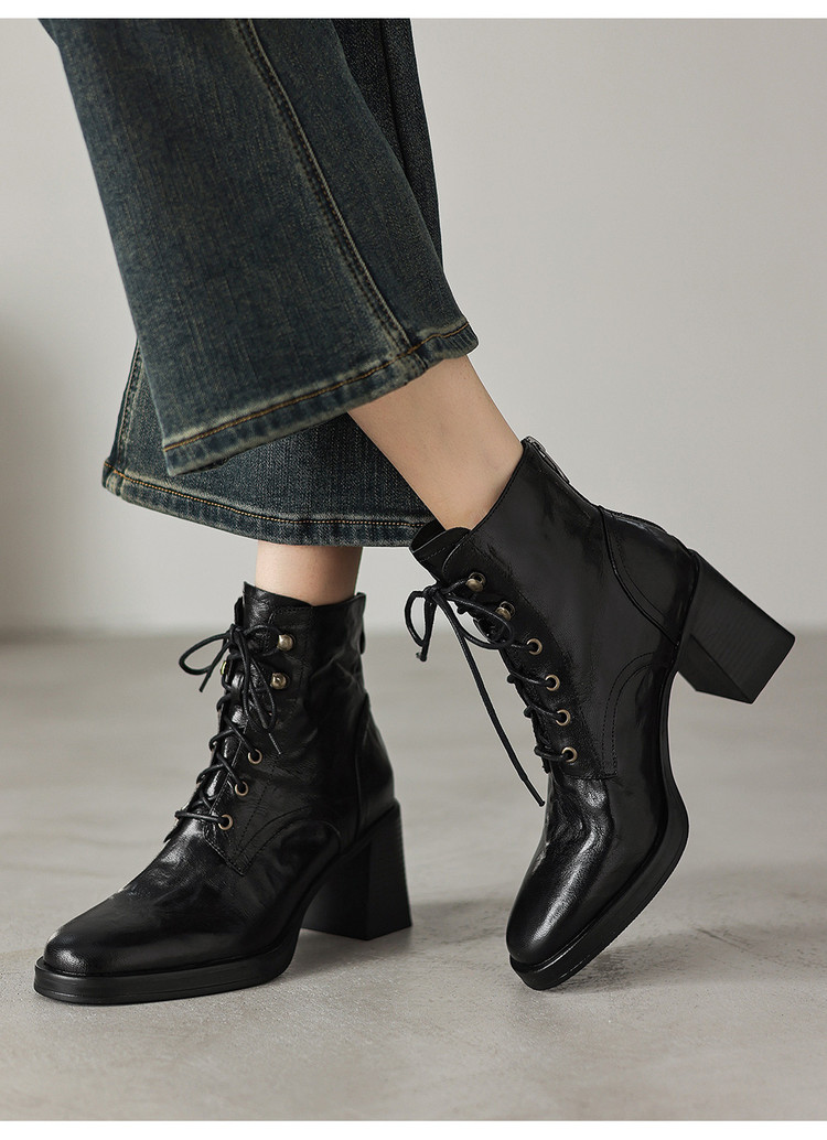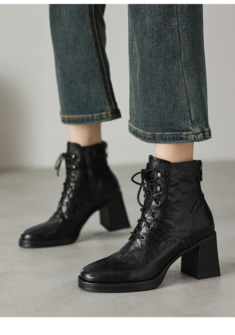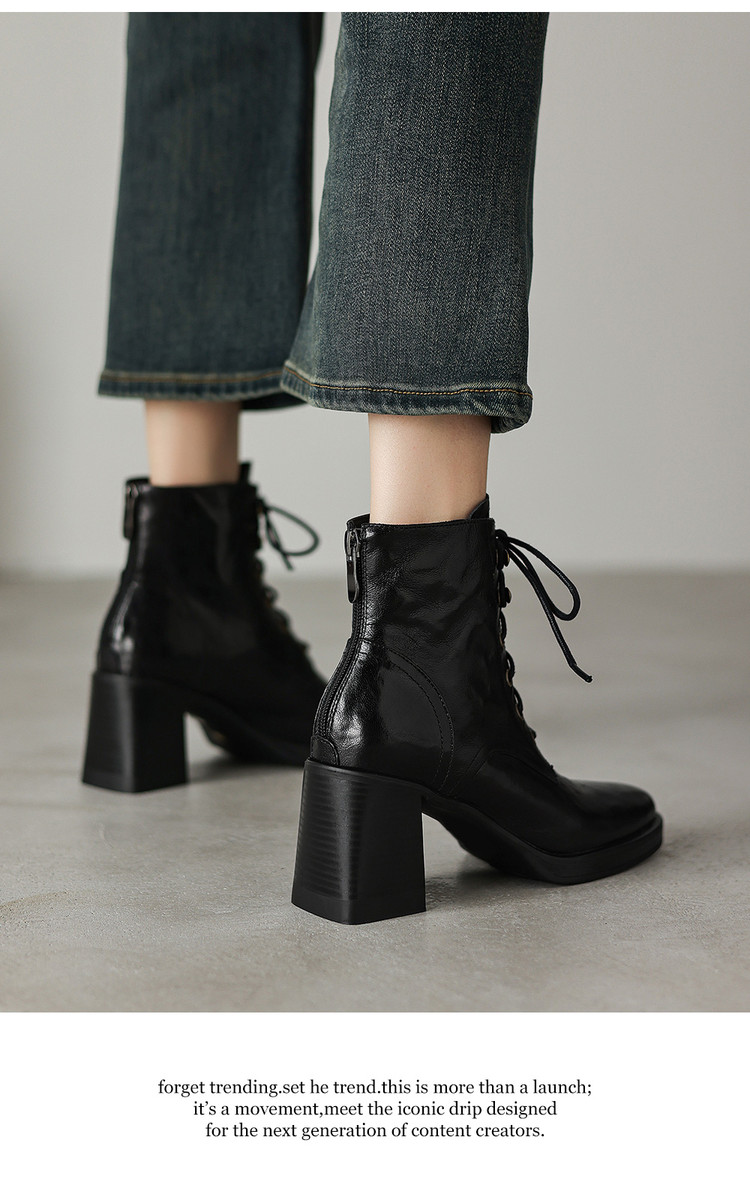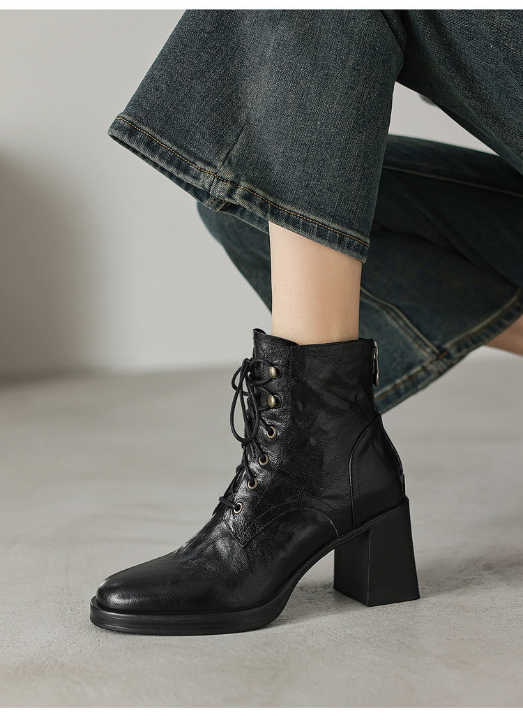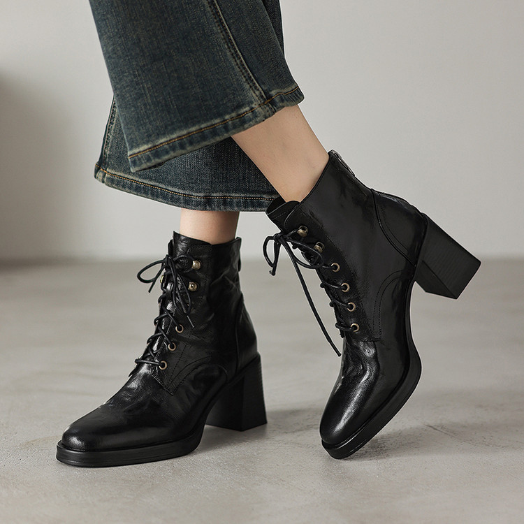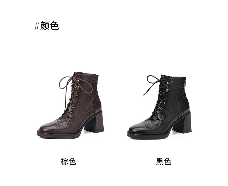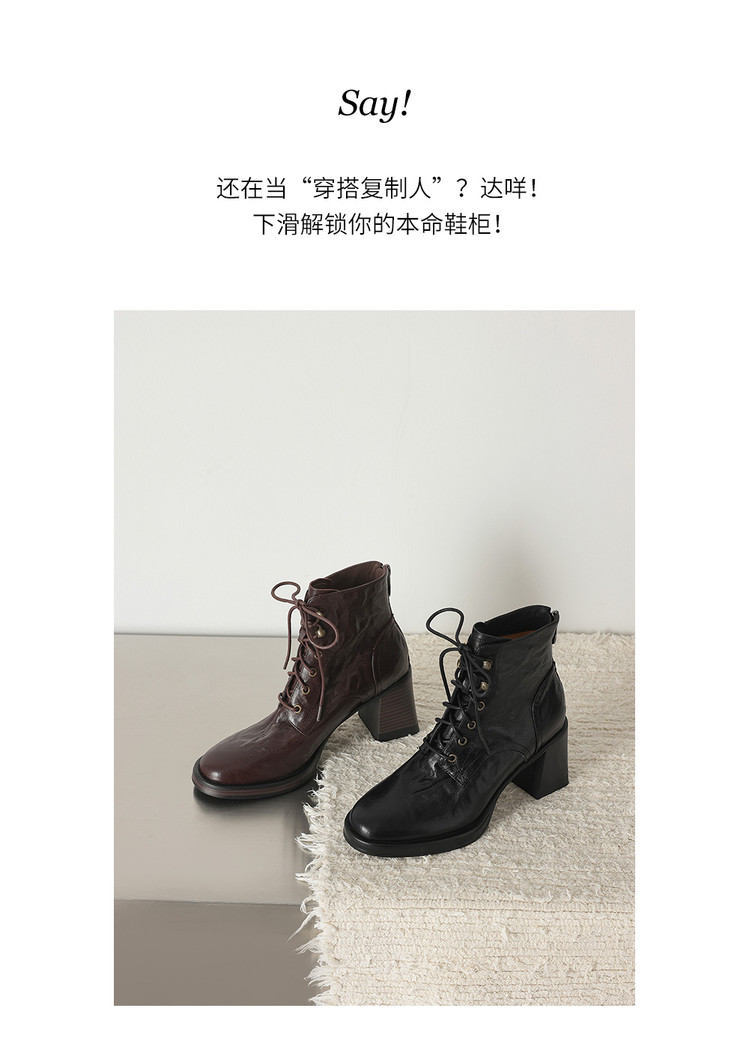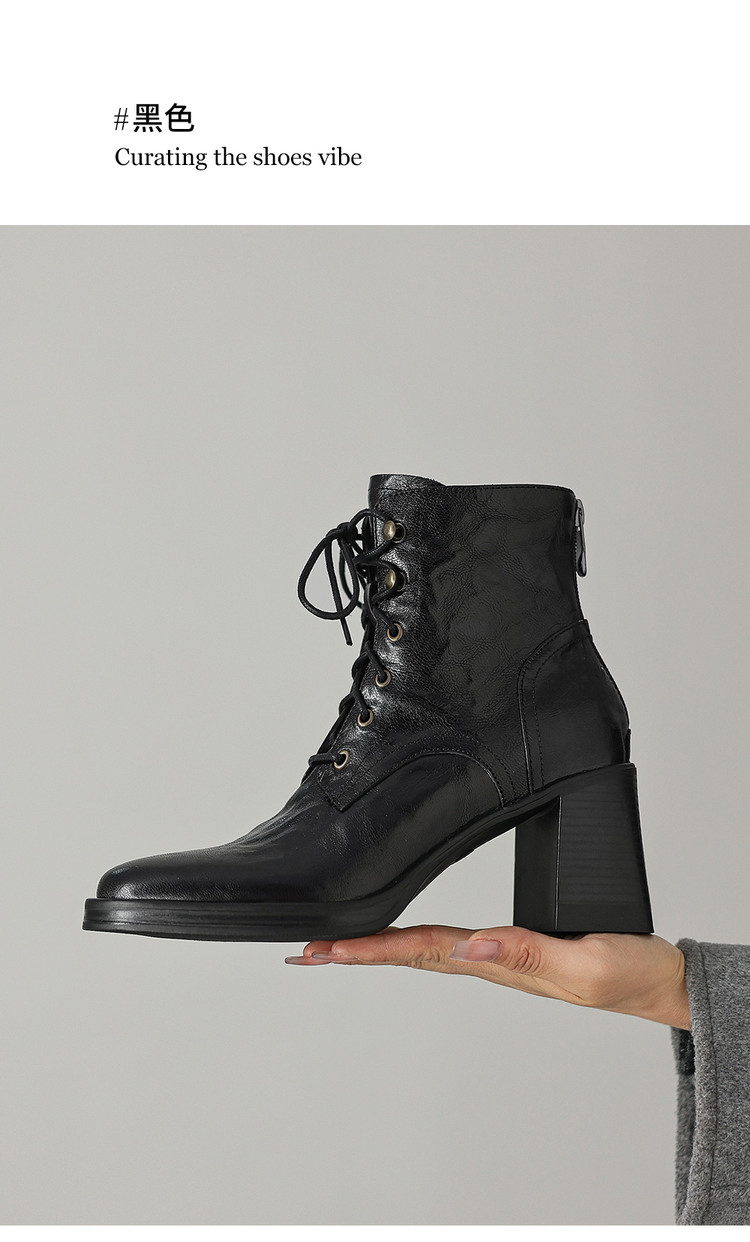 【预售5天】真皮方头粗跟马丁靴女秋冬英伦风复古百搭高跟系带短靴HB&1408