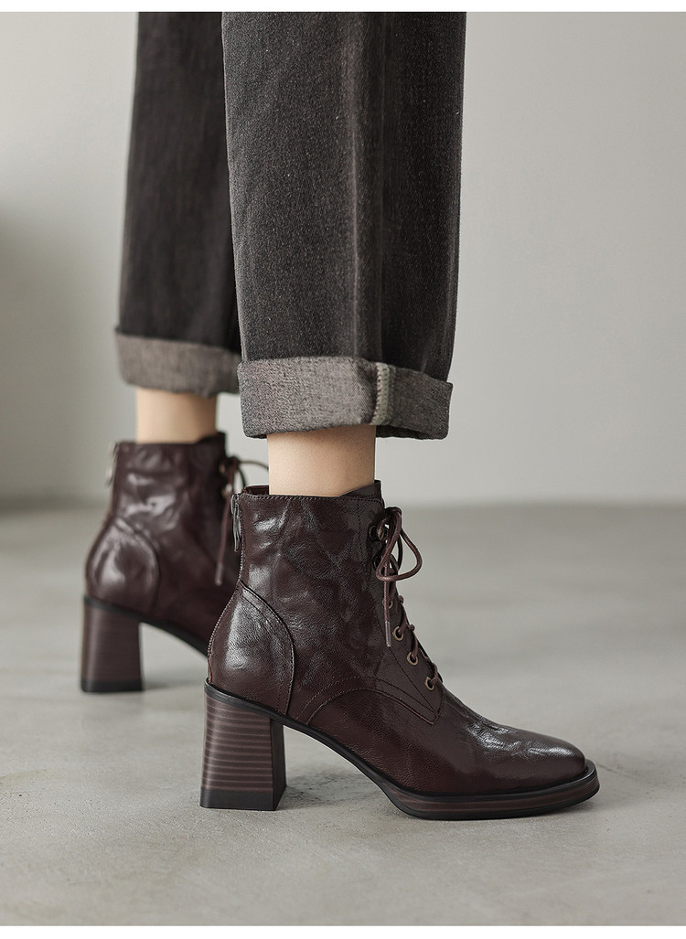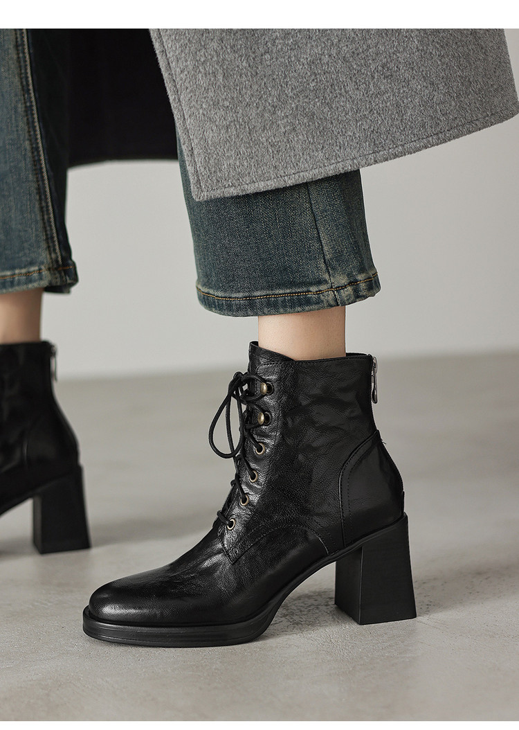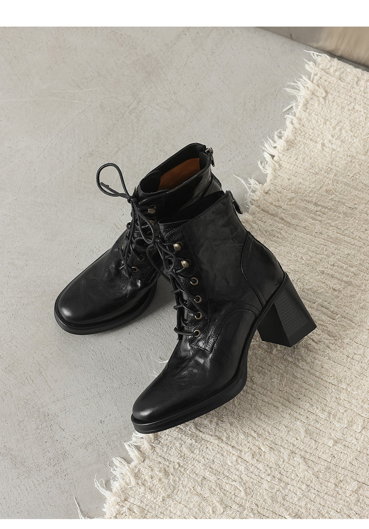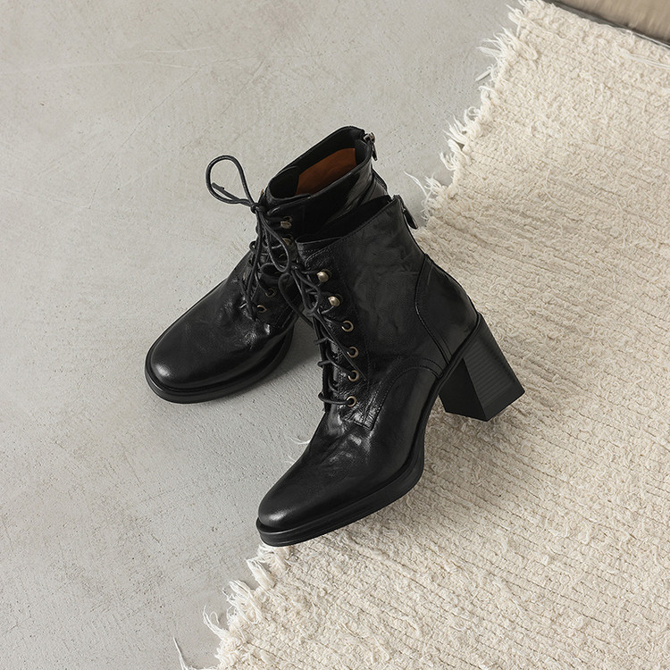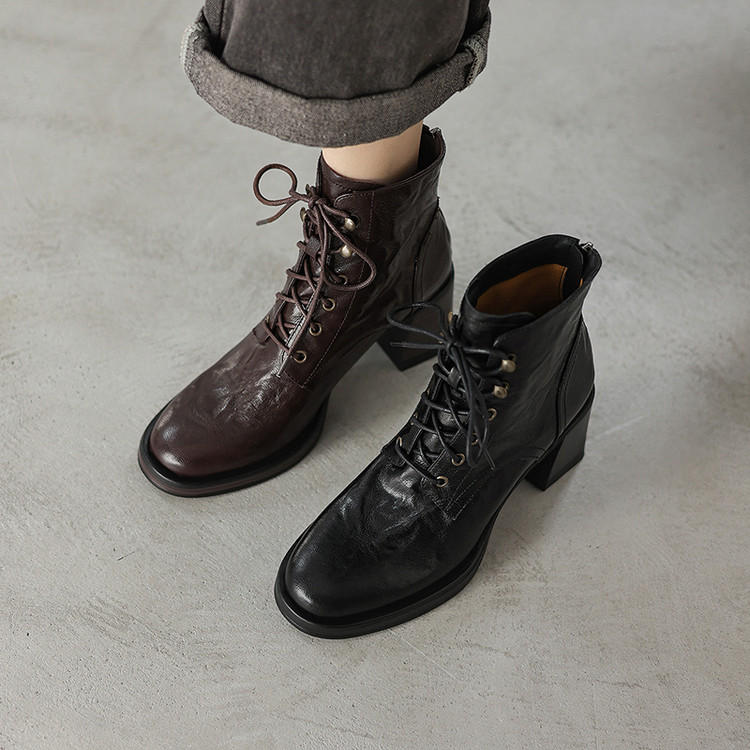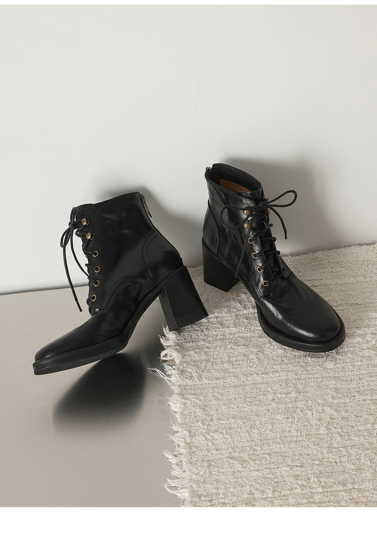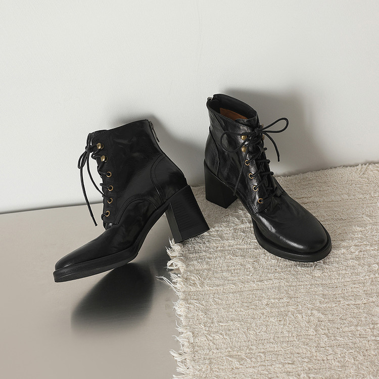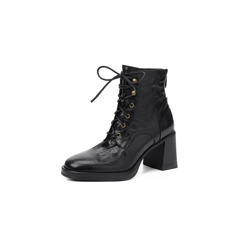 【预售5天】真皮方头粗跟马丁靴女秋冬英伦风复古百搭高跟系带短靴HB&1408