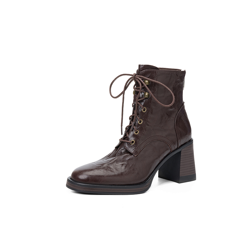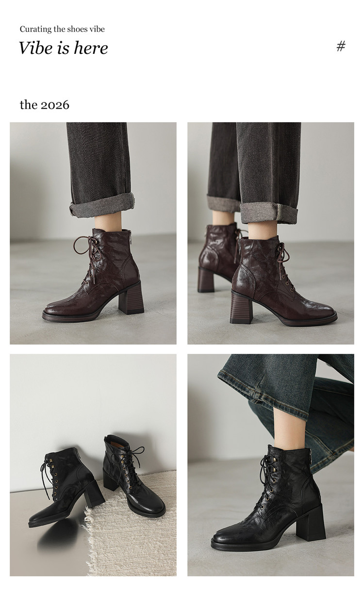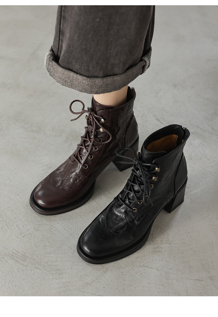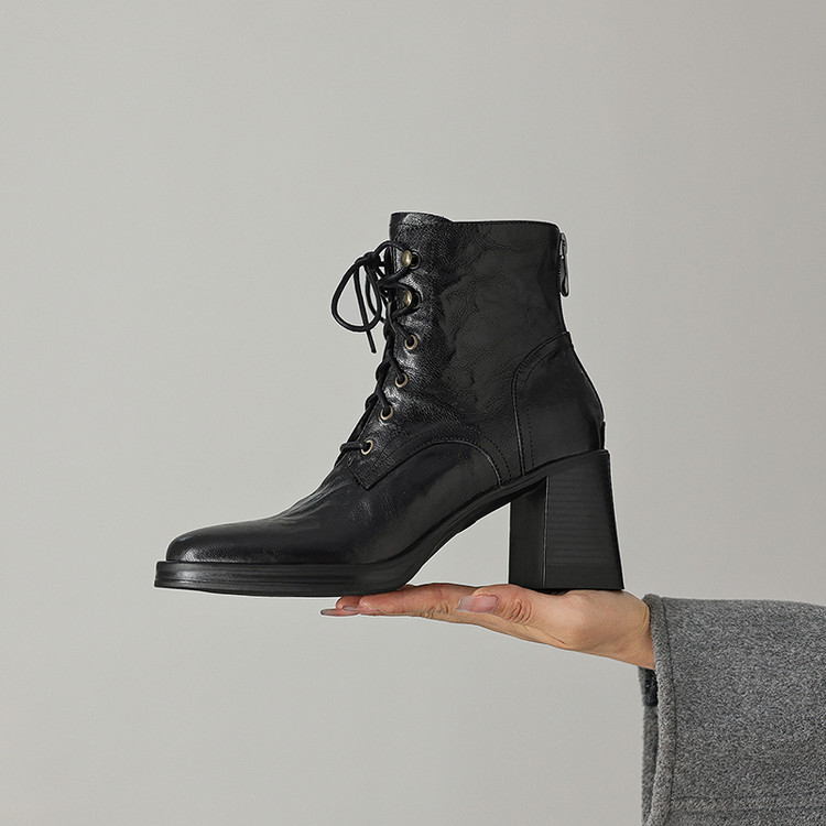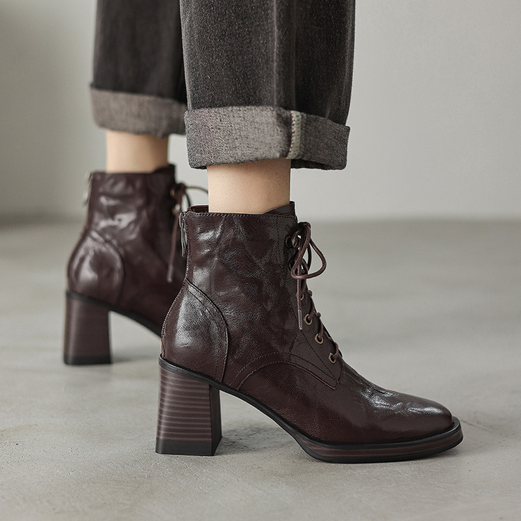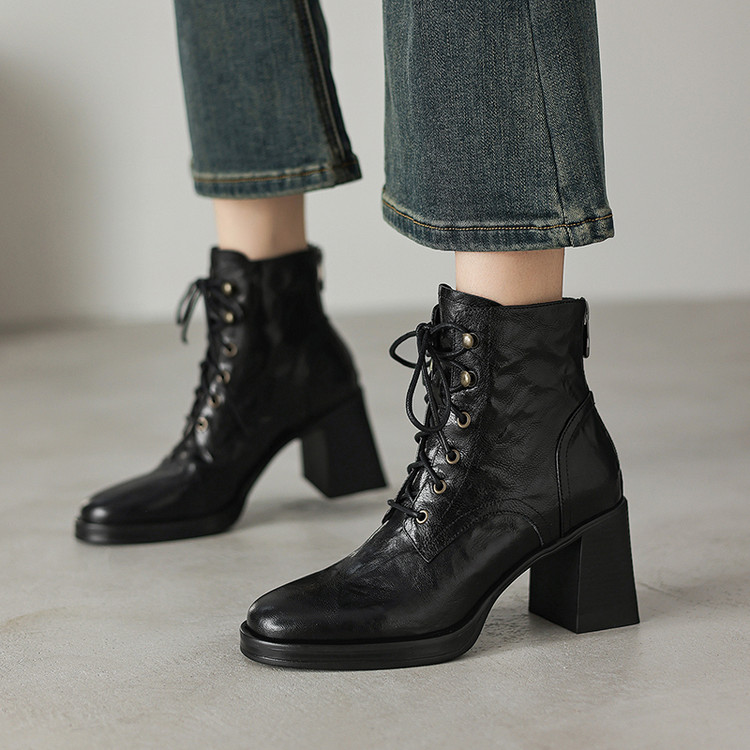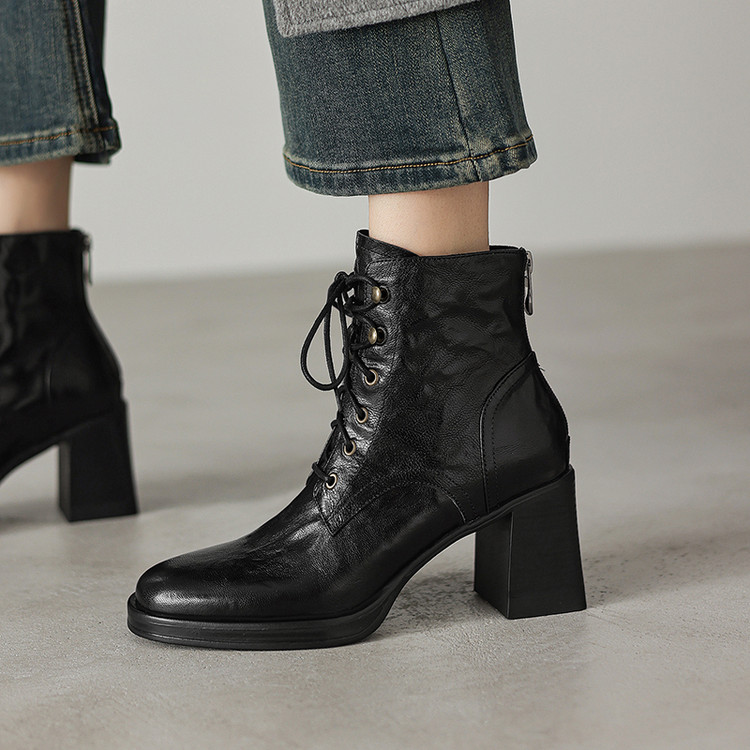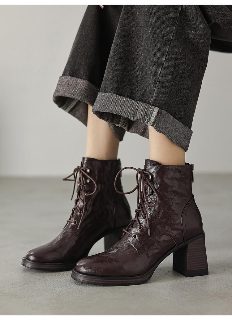 【预售5天】真皮方头粗跟马丁靴女秋冬英伦风复古百搭高跟系带短靴HB&1408