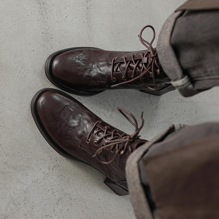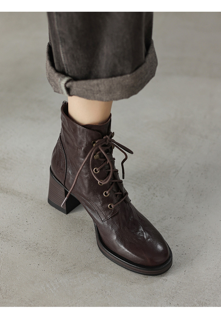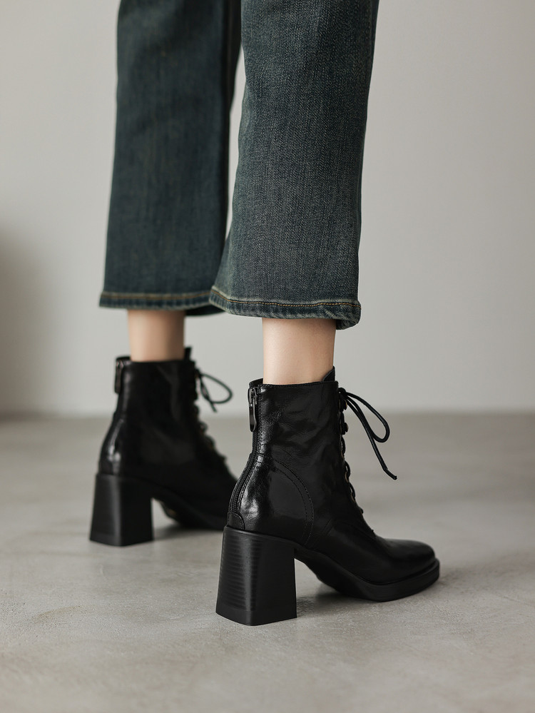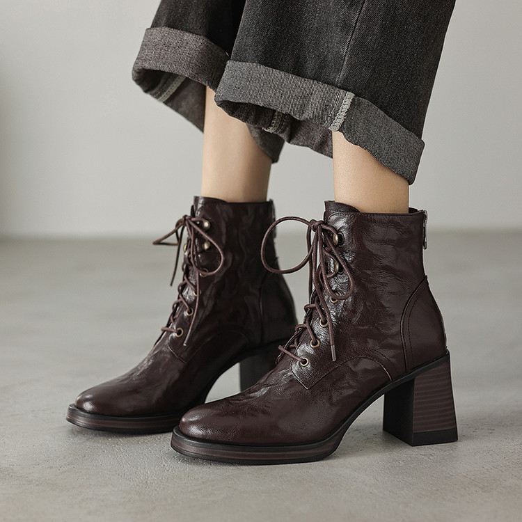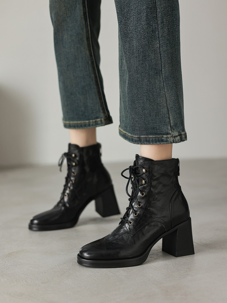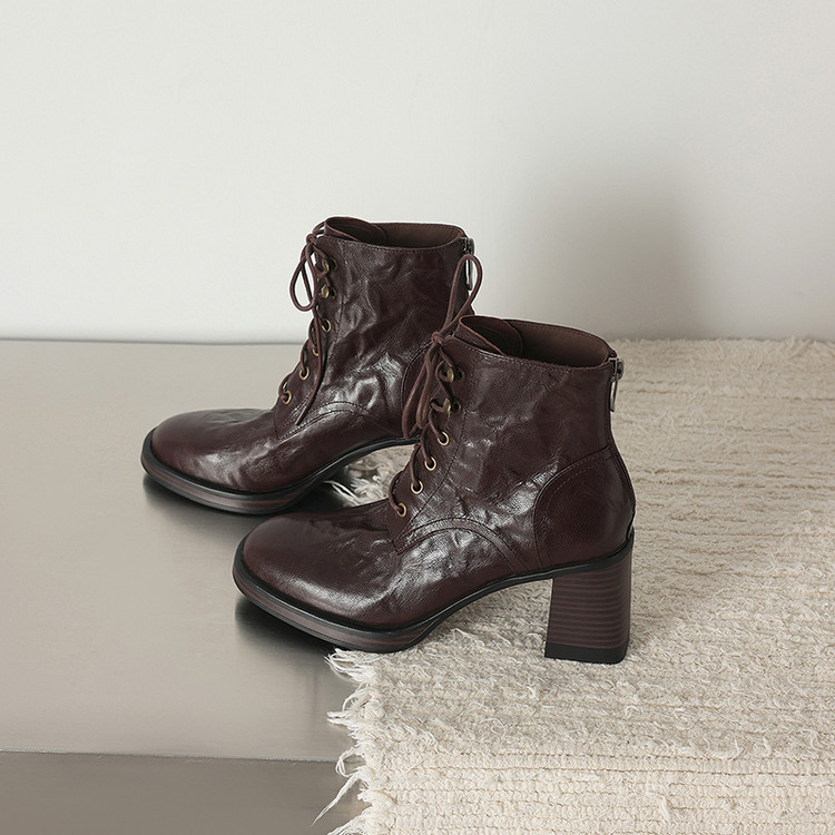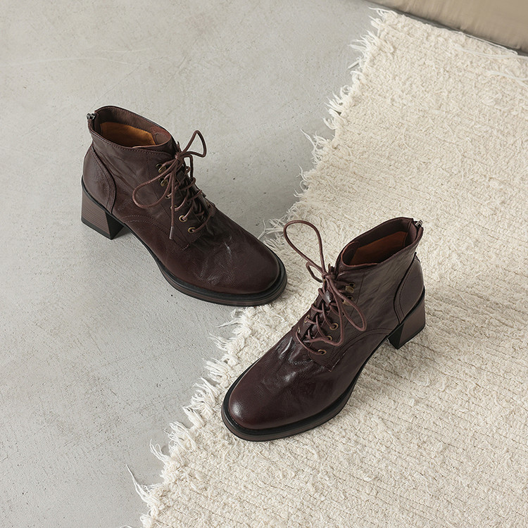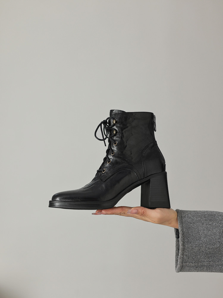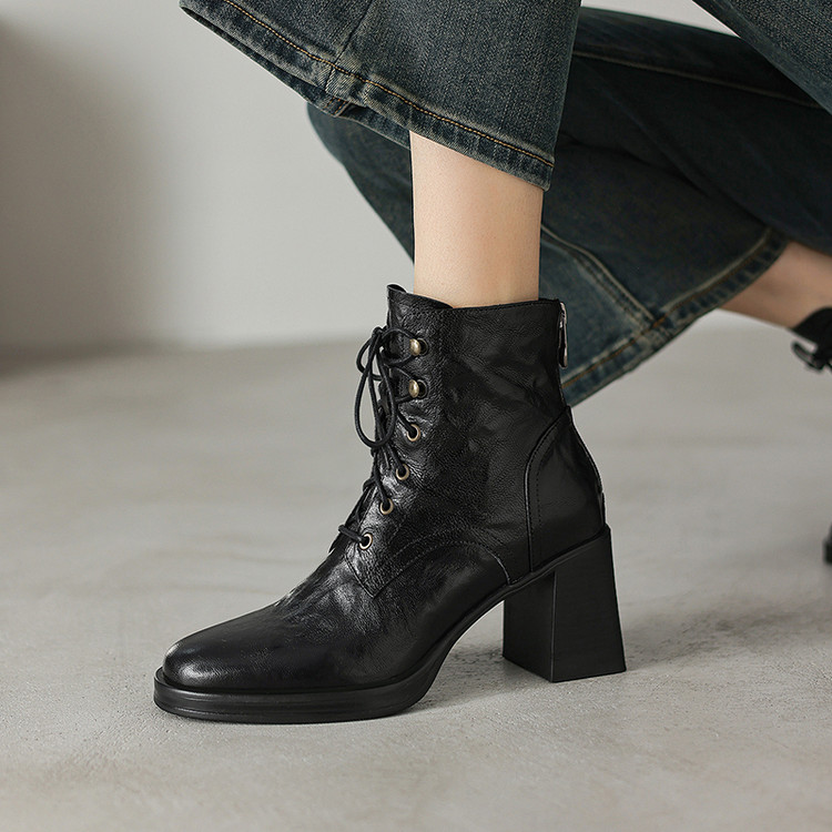 【预售5天】真皮方头粗跟马丁靴女秋冬英伦风复古百搭高跟系带短靴HB&1408