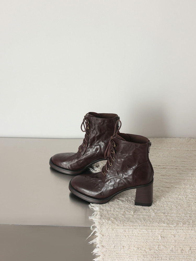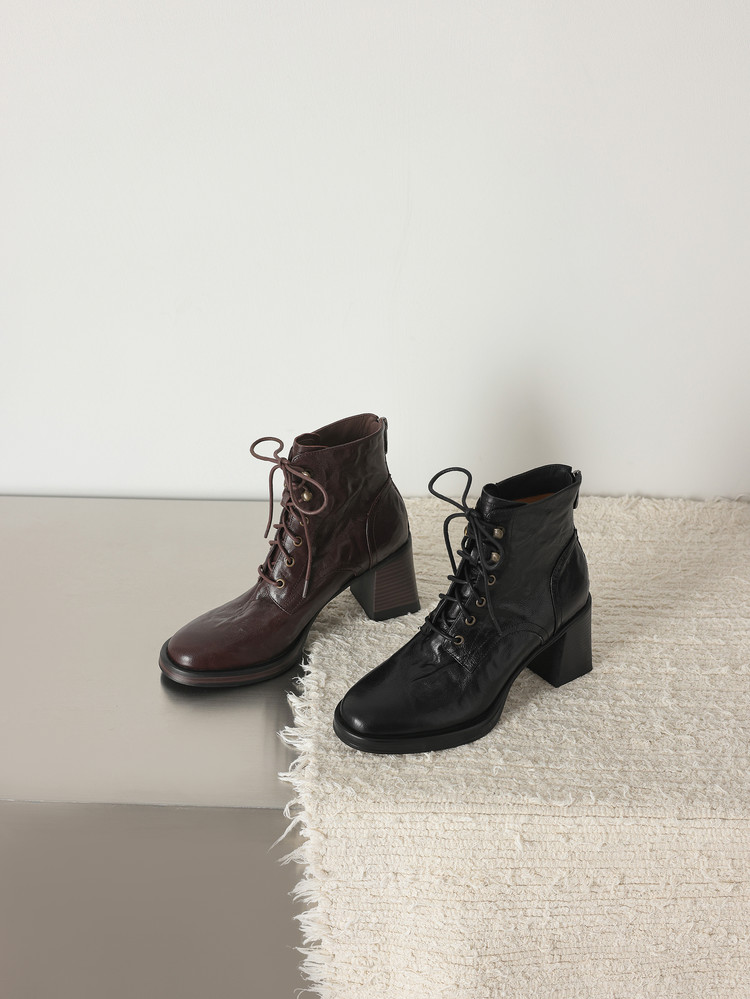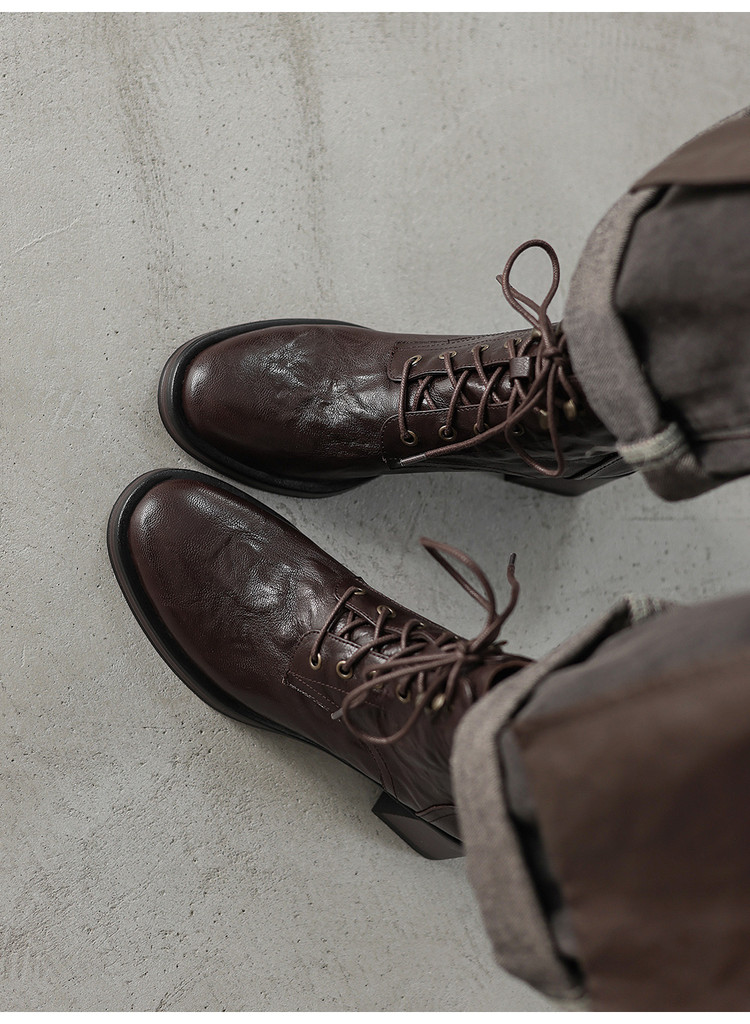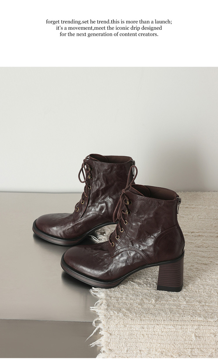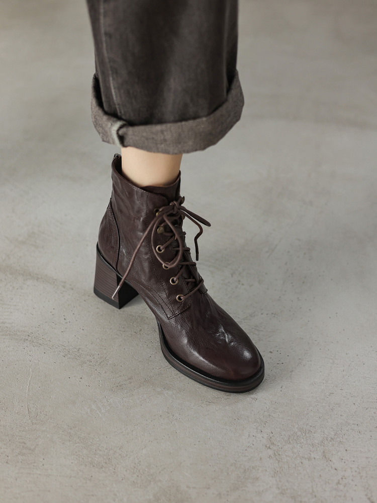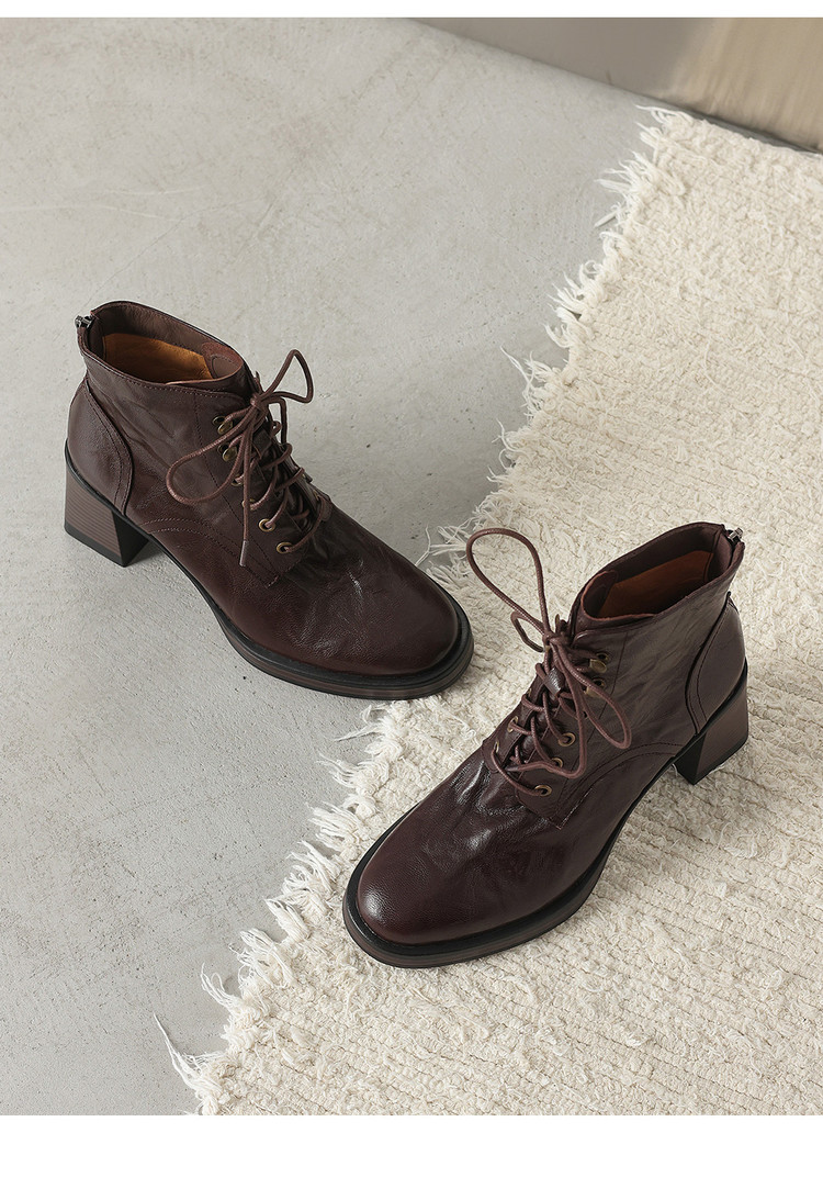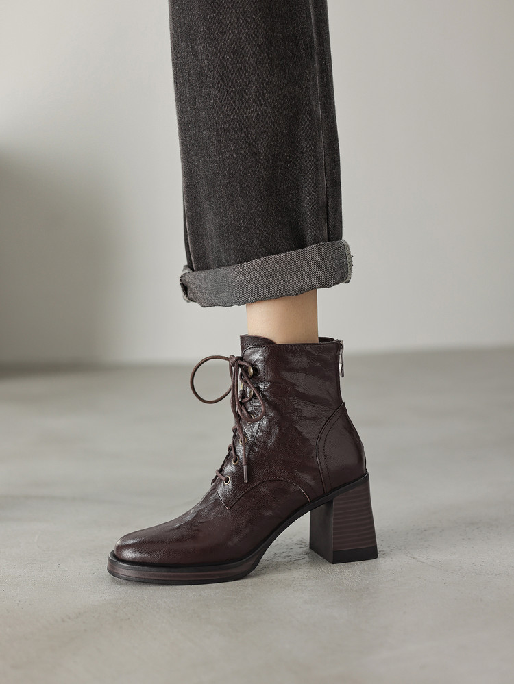 【预售5天】真皮方头粗跟马丁靴女秋冬英伦风复古百搭高跟系带短靴HB&1408