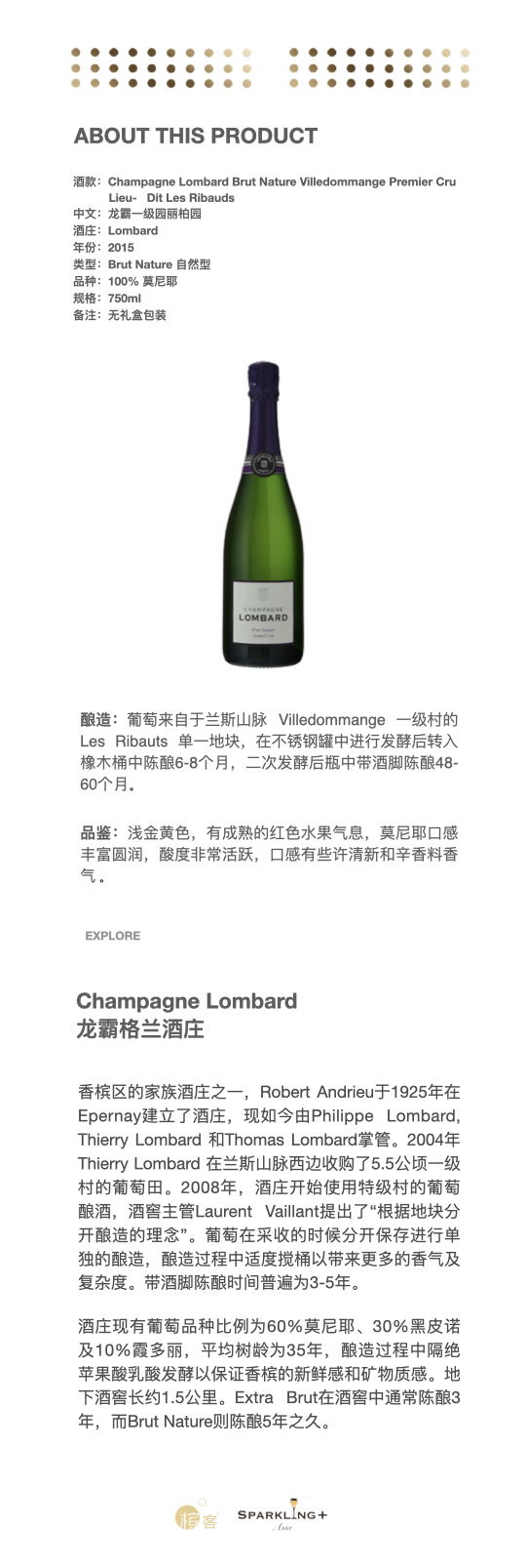 Champagne Lombard Brut Nature Villedommange Premier Cru Lieu-Dit Les Ribauds 龙霸一级园丽柏园