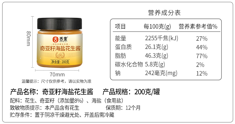 【舌里奇亚籽海盐花生酱200g】轻食好搭档 配料简单