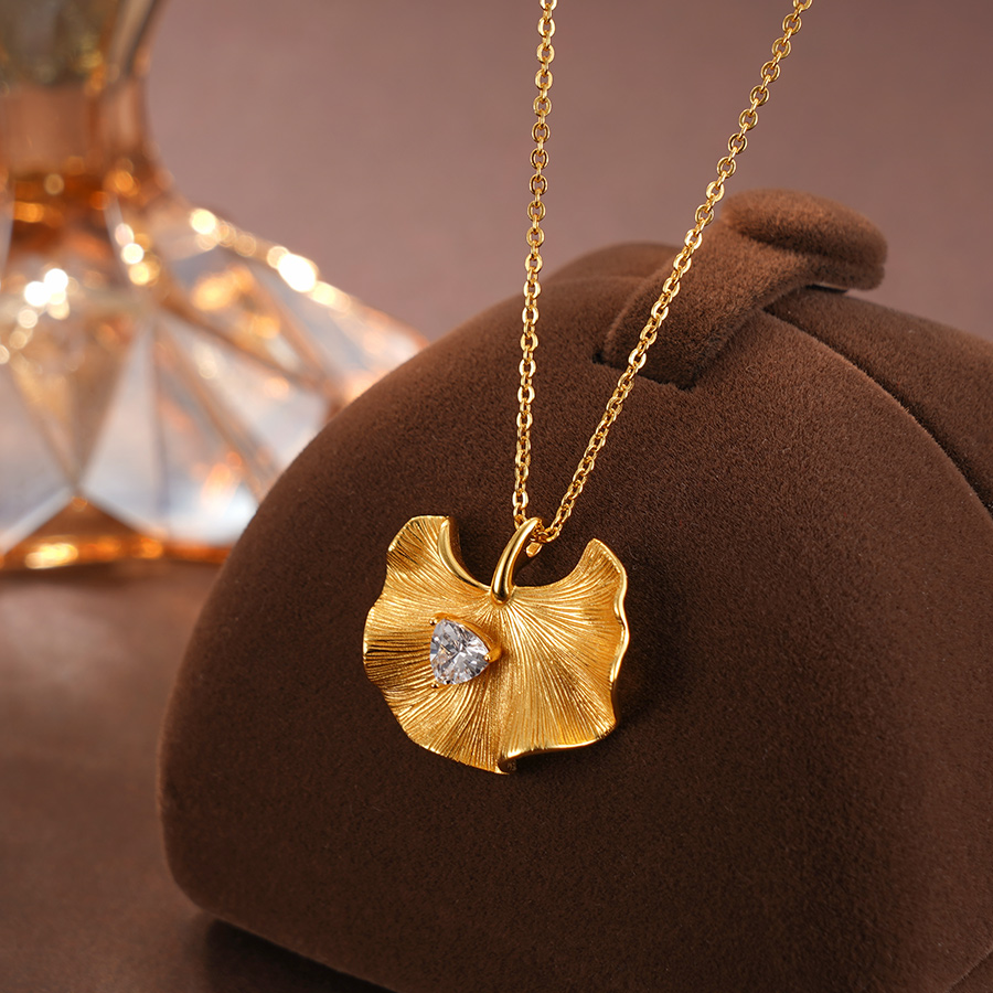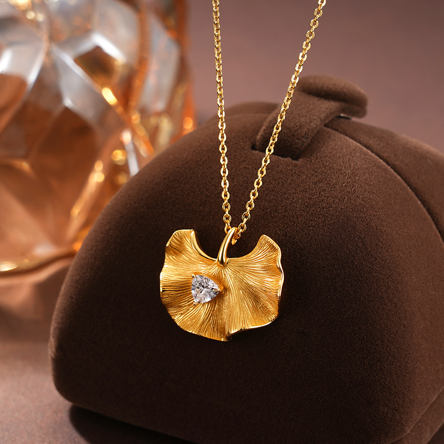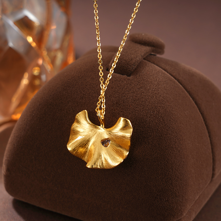 【寓意】:项链设计灵感源自银杏, 银杏叶镀金处理,中心镶嵌锆石, 材质交融,对比鲜明。寓意幸运永恒,吉祥永驻。
