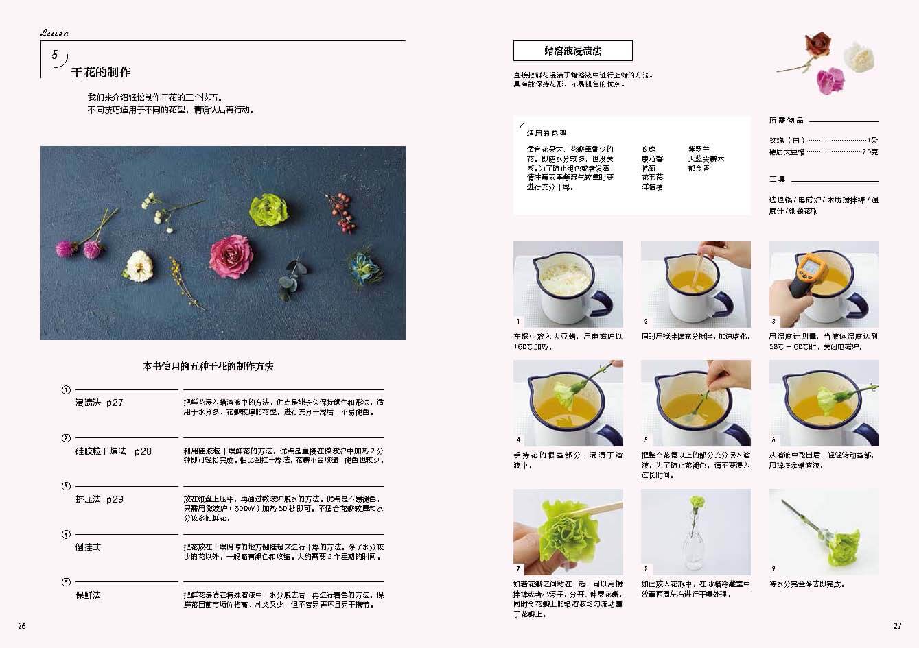 硅胶粒干燥法 p28:利用硅胶粒干燥鲜花的方法。优点是直接在微波炉中加热2分钟即可轻松完成。相比倒挂干燥法,花瓣不会收缩,褪色也较少。