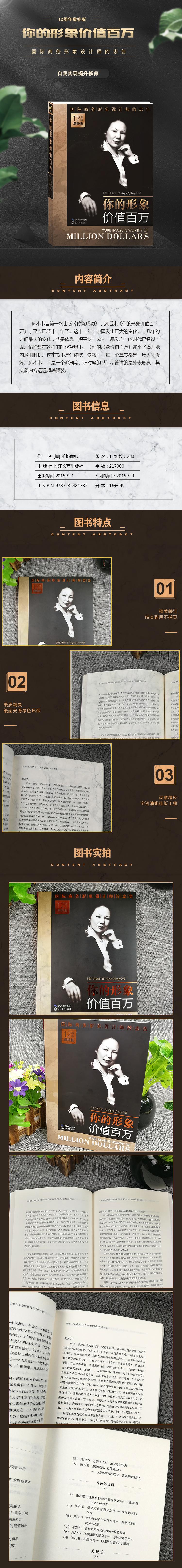 读者可以细细地慢慢品嚼和借鉴。因为你也可以塑造你的新形象,并且借此提升你的社会价值,你的形象同样也可以价值百万。