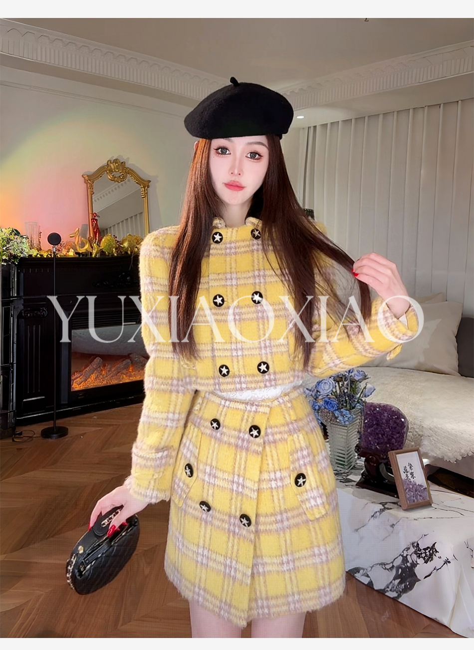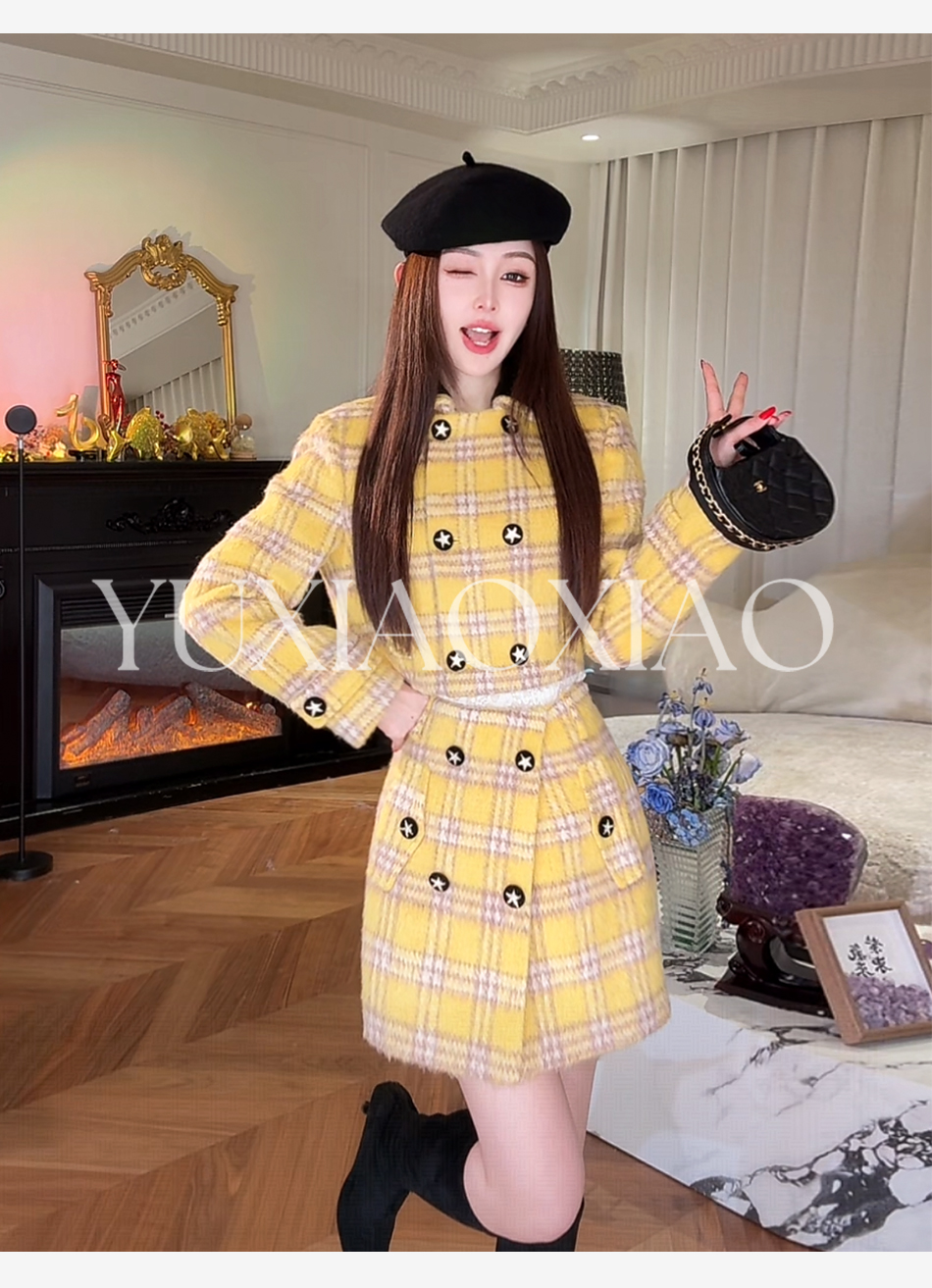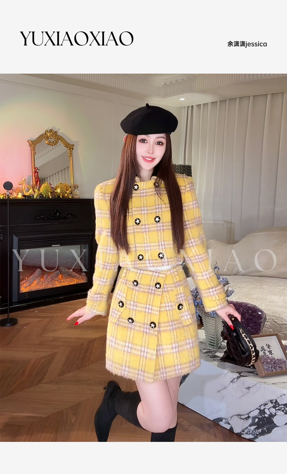 余潇潇【落日甜曲】绵羊毛混纺复古格纹毛呢短外套&A字短裙裤套装