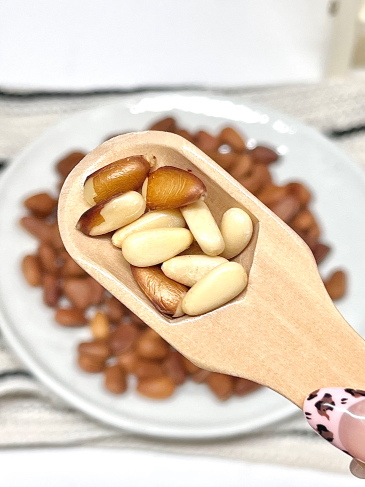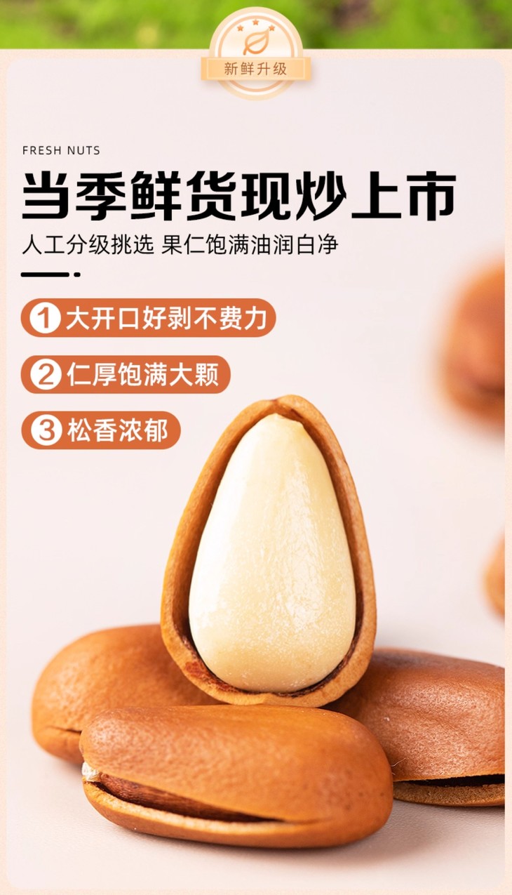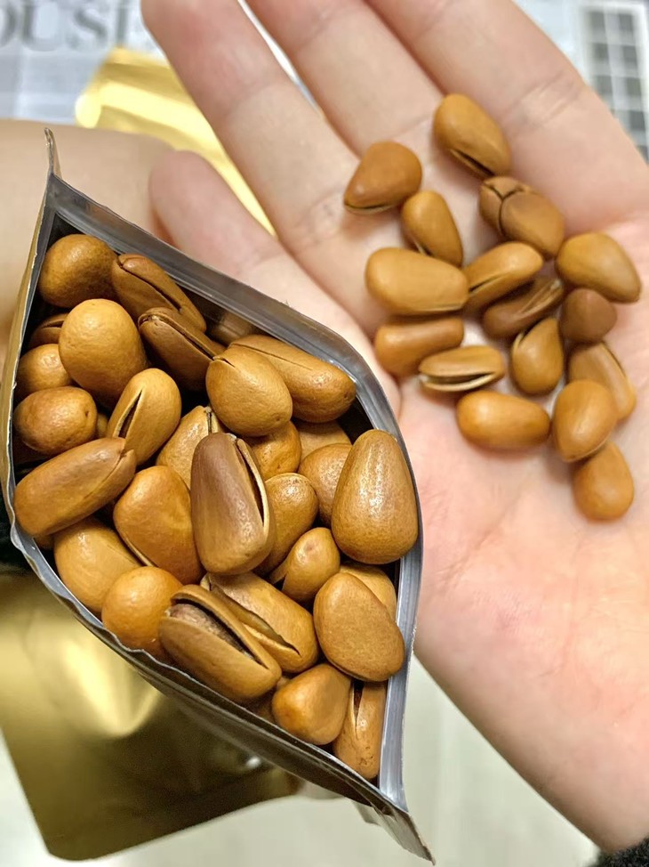 【君味唻开口松子】直接让我磕到上头‼️ 这款真的是坚果界的宝藏✨ 这东北红松子也太绝了👏👏 每一颗都酥香不腻、粒粒饱满圆润🥰 天然浓郁的松木坚果香扑面而来 开口率高达百分之98以上📈 棕褐薄壳一捏就开👌 奶白饱满的果仁入口香醇 一口一个酥香,扎实的果仁越嚼越香😆