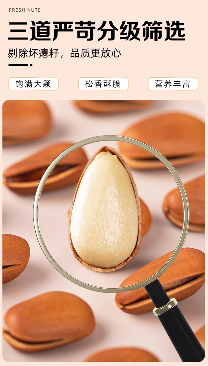 开口松子让你随时随地享受美味😋 ✅ 办公室能量补给站💼:不用剥壳器,手剥轻松搞定,不脏手、无异味,吃的时候安安静静🤫不会打扰别人 ✅ 宅家追剧最佳CP📺:一边看剧一边剥,不知不觉一集剧追完,嘴里香香的,壳子收在小盘子里,收拾也方便🧹 ✅ 朋友聚会氛围组🎉:大家一边聊天一边剥,瞬间拉近距离,拿出来看着就有食欲,补充能量又顶饿,方便又卫生😋