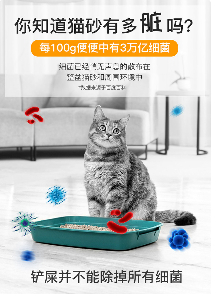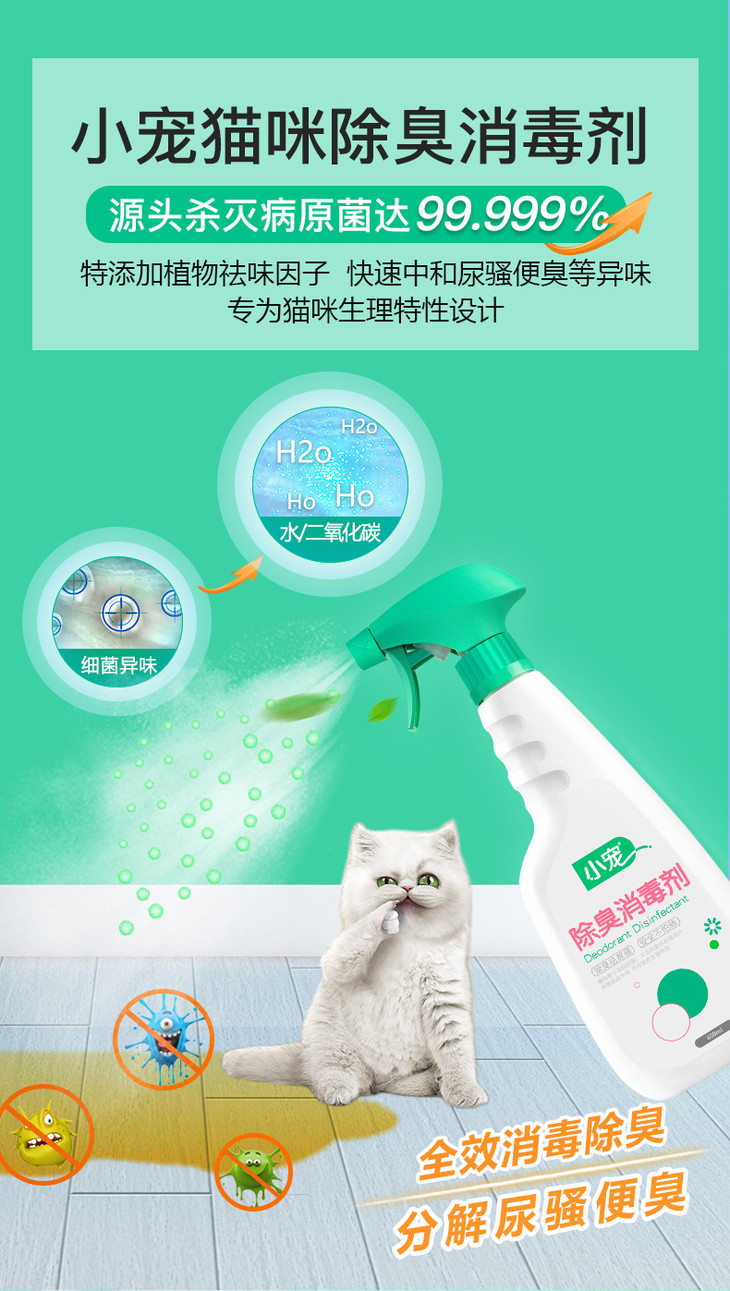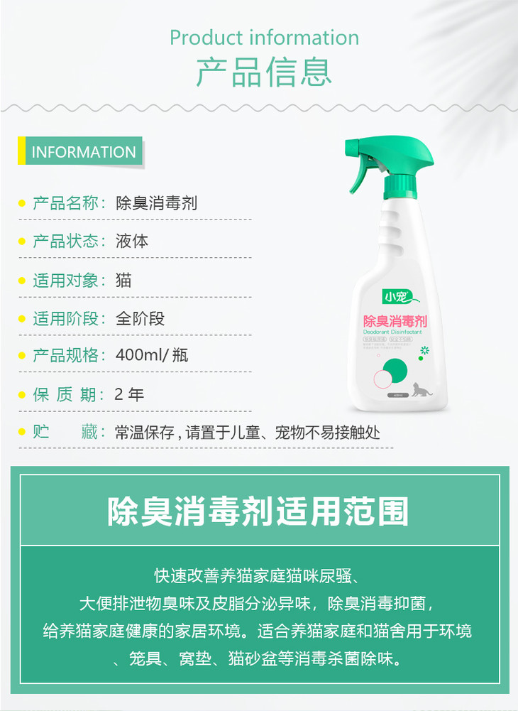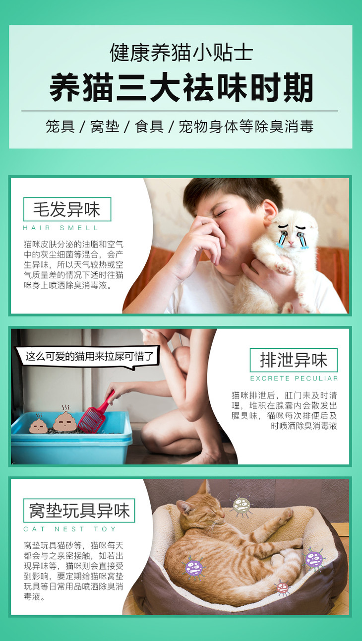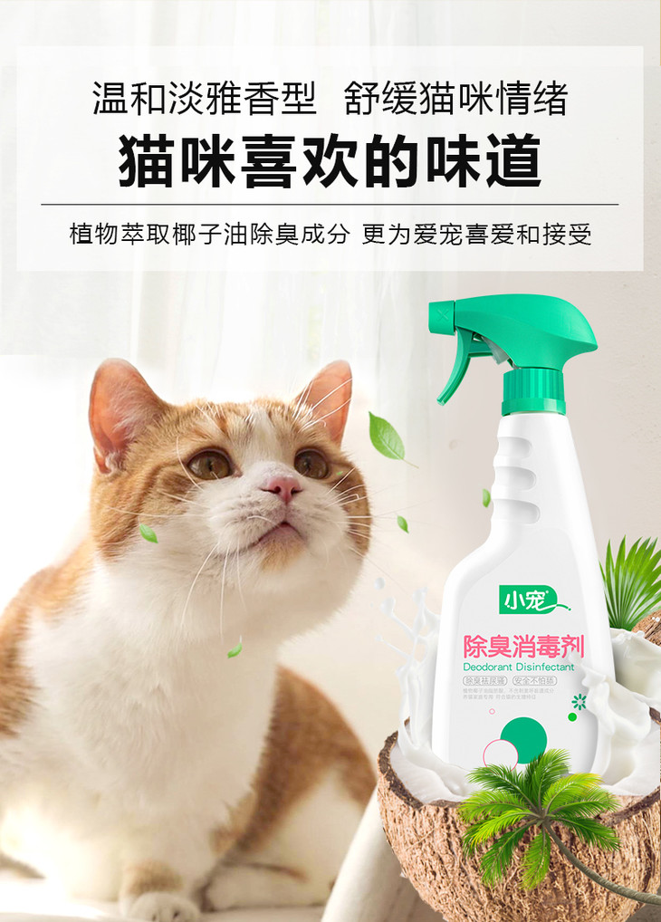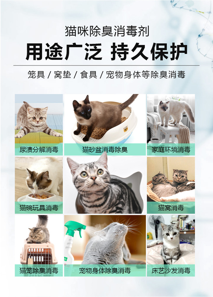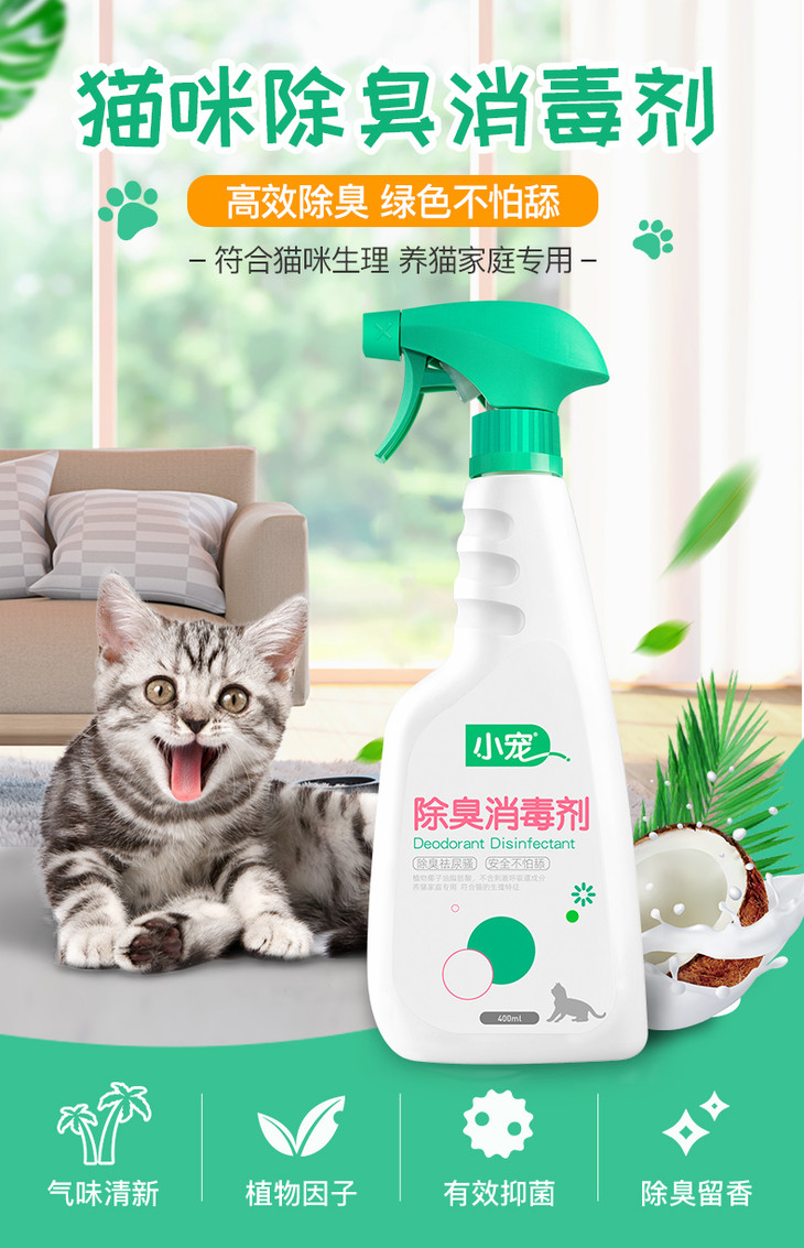 2、针对猫咪嗅觉,针对性调配除臭剂气味,猫咪不反感;低刺激不伤害猫咪嗅觉
