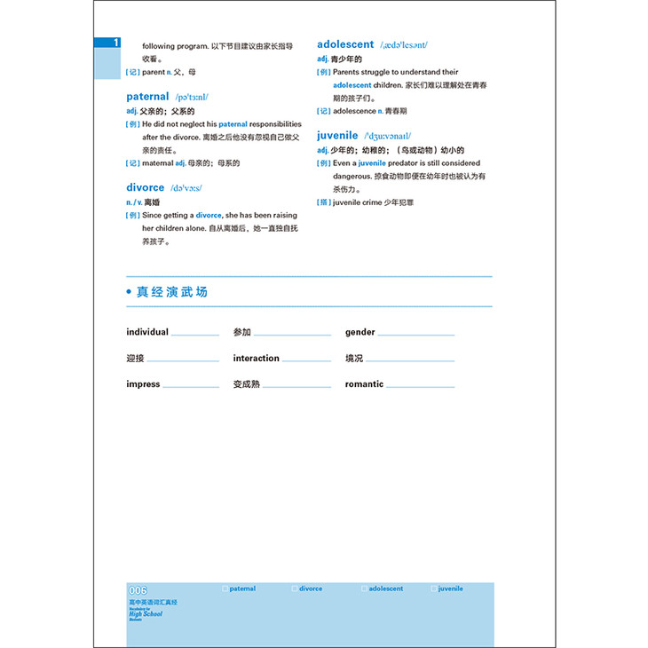 《高中英语词汇真经》由知名英语教育专家刘洪波老师编著,以教育部颁布的《普通高中英语课程标准》为编写依据,全书共分13单元,包含高中阶段要求掌握的词汇,并收录一部分雅思、托福、SAT等国际英语考试常考词汇,供有留学意向的学生拓展词汇。本书的最大特点是打破从A-Z的顺序背单词,将单词按场景或主题进行分类,帮助学生通过逻辑关联记单词,从而记得更牢固。