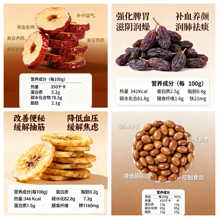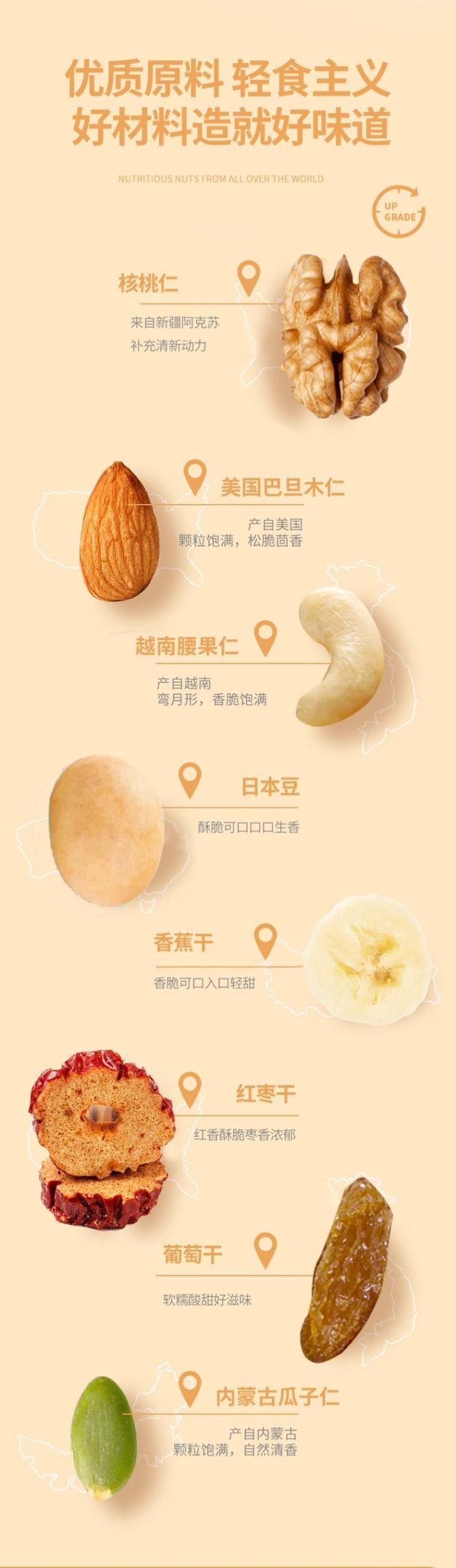 🟠核桃仁(新疆阿克苏):黄金产区孕育,果仁饱满油香浓,人工筛除坏果,吃着放心😌 🟠巴旦木仁(美国):坚果顶流,颗粒饱满带茴香味,大小筛选,口感统一👌 🟠腰果仁(越南):弯月形果仁,脆而不硬无苦涩,一口满是幸福感💖 🟠日本豆:外裹秘制香衣,内藏脆花生仁,追剧吃停不下来📺 🟠香蕉干:新鲜香蕉低温烘,香脆轻甜无齁感,清爽不腻🍃 🟠红枣圈:枣香浓郁,肉质紧实,有嚼劲🔴 🟠葡萄干:日照足糖分高,肉嘟嘟无沙粒,软糯酸甜🍯 🟠南瓜子仁(内蒙古):颗粒金黄无多加工,保留原味,香脆越嚼越香😋