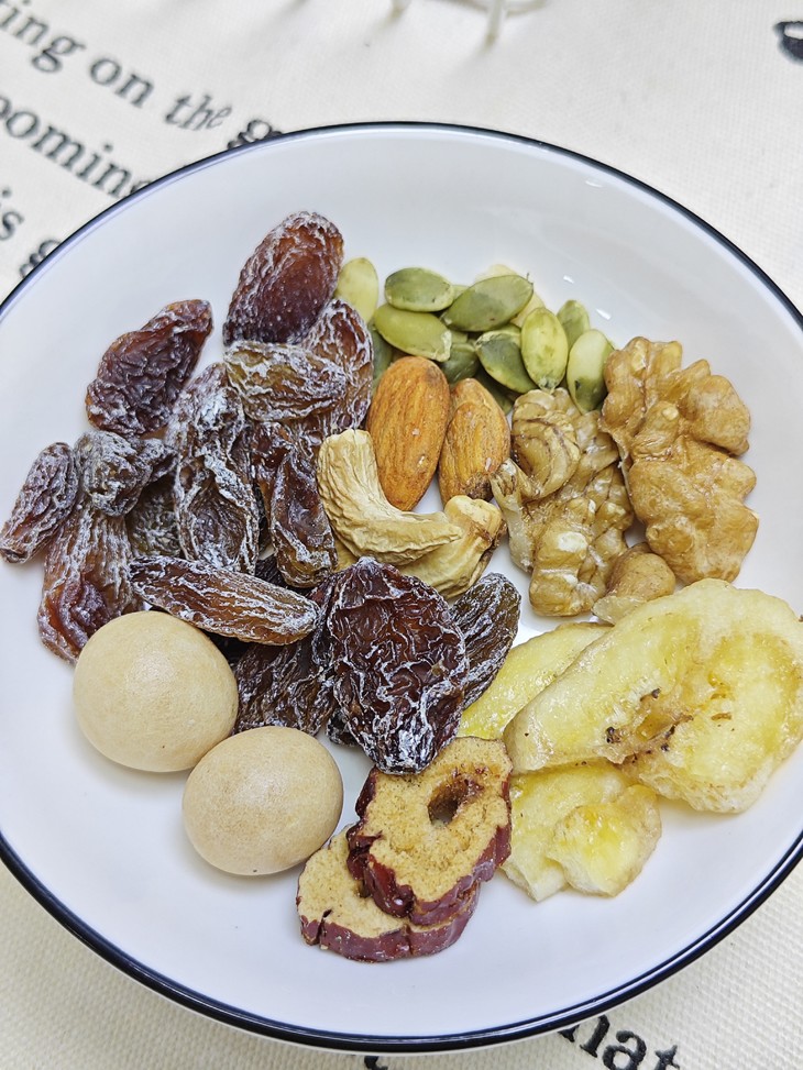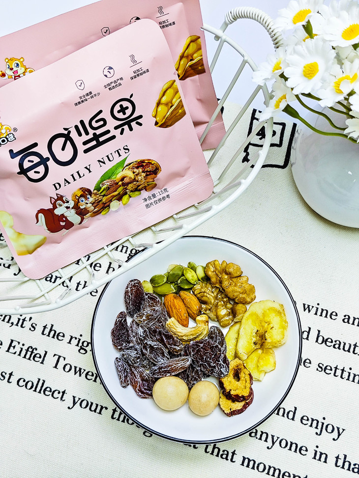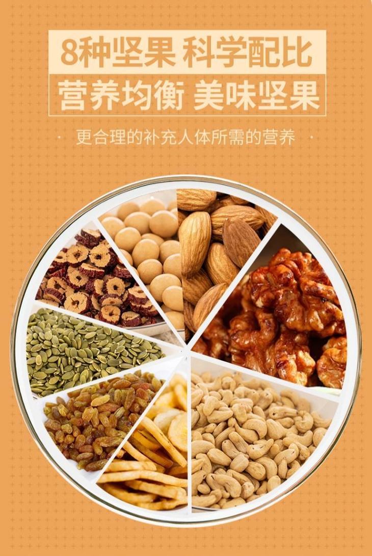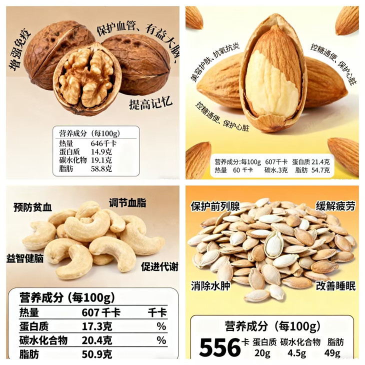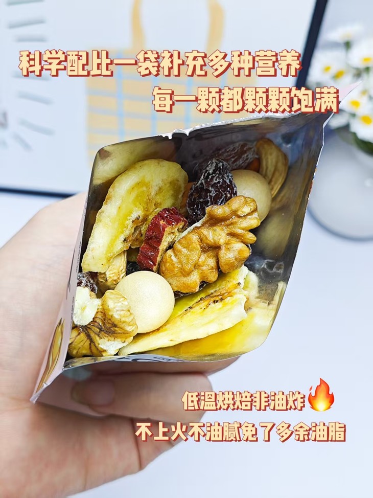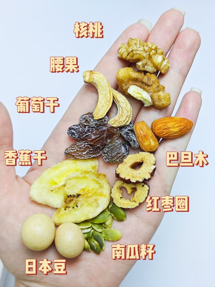 坚果的神仙功效:吃对坚果,健康加倍! 很多人觉得坚果只是零食,但其实它的营养价值超高! 咱们这款每日坚果8种配料,吃对了真的能健康加倍✨ 🔻核桃仁(智慧果):富含DHA和不饱和脂肪酸,孩子吃能助大脑发育,上班族吃能提记忆力🧠 🔻巴旦木仁:维生素E➕膳食纤维,抗氧化润皮肤,还能促肠道蠕动改善便秘💧 🔻腰果仁:优质蛋白质➕铁锌矿物质,增强免疫力,还能预防贫血🛡️ 🔻南瓜子仁:锌➕镁元素,男性吃护前列腺,熬夜党吃能缓解疲劳、改善睡眠😴 🔻红枣圈:补中益气还养血,女生多吃能改善气色,素颜都显红润❤️ 🔻葡萄干:葡萄糖➕多种维生素,低血糖饿了吃点,瞬间补能量🔋 🔻香蕉干:钾元素➕维生素B6,稳血压还能缓解焦虑,保持好心情😊 🔻日本豆:蛋白质➕不饱和脂肪酸,健身党吃能增饱腹感,减少高热量摄入🍽️