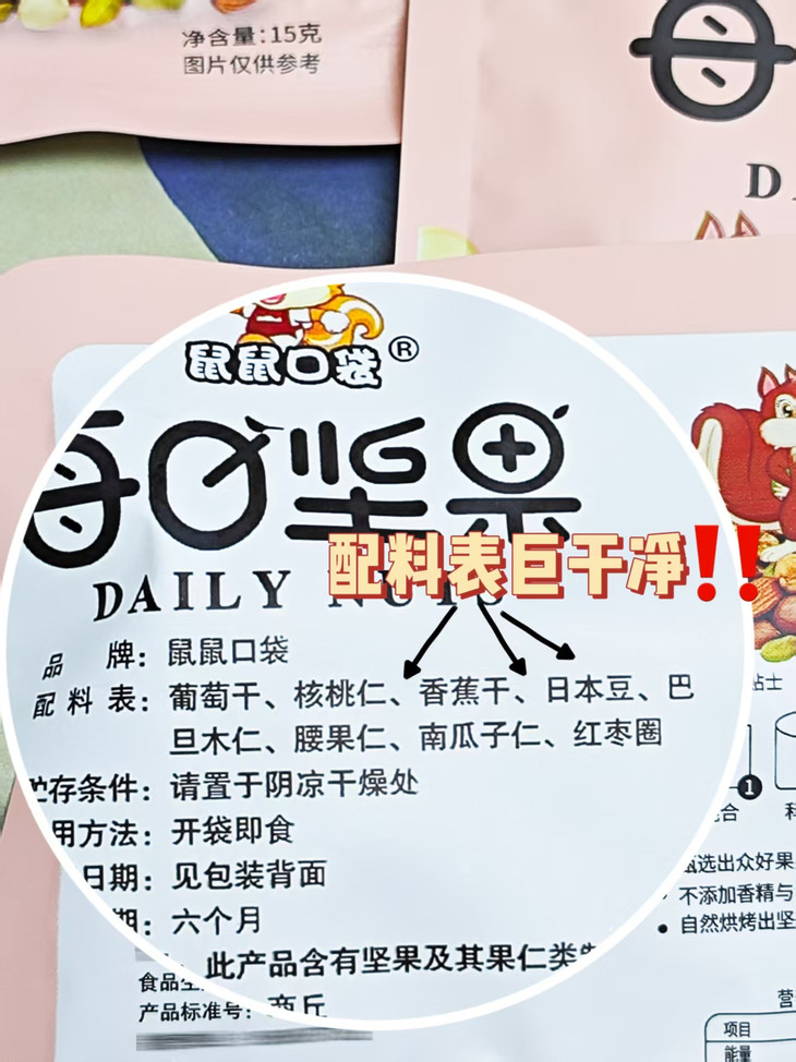 咱们这款每日坚果,配料表干净到能当镜子照: 葡萄干、核桃仁、香蕉干、日本豆、巴旦木仁、腰果仁、南瓜子仁、红枣圈 整整8种,没有任何多余添加❌ 严选全球核心产区🌍从源头保证品质 每一颗都是千里挑一的好货🌟