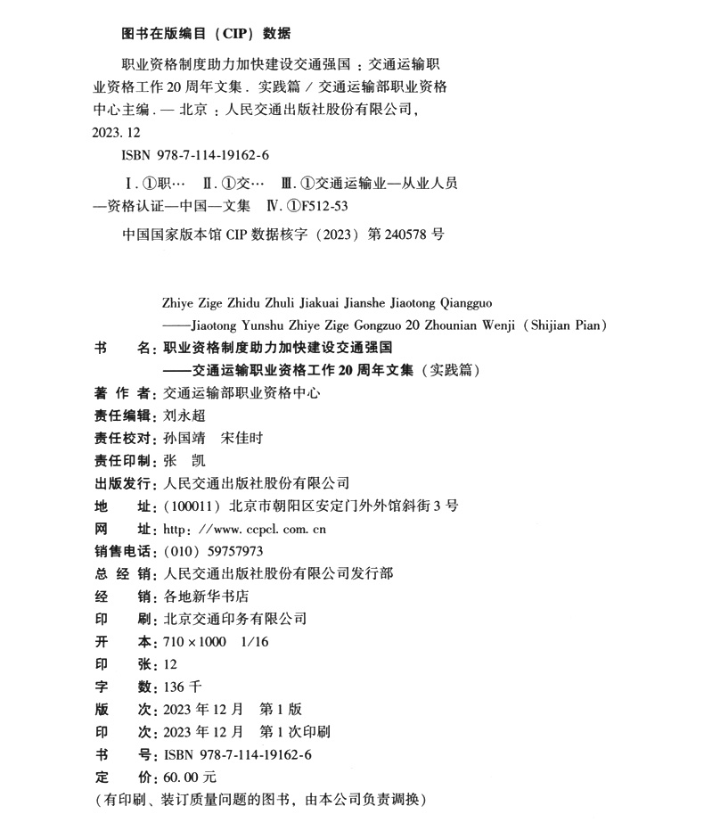 书名:职业资格制度助力加快建设交通强国——交通运输职业资格工作20周年文集(实践篇)