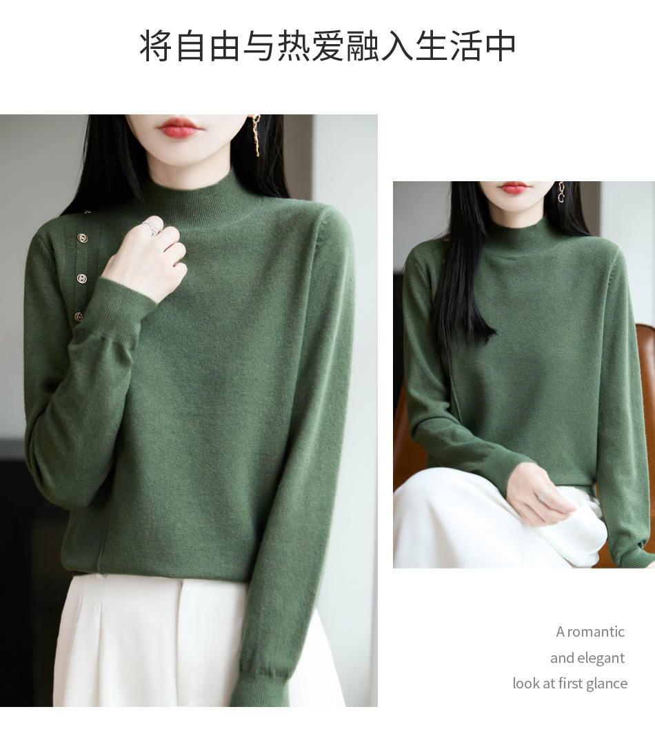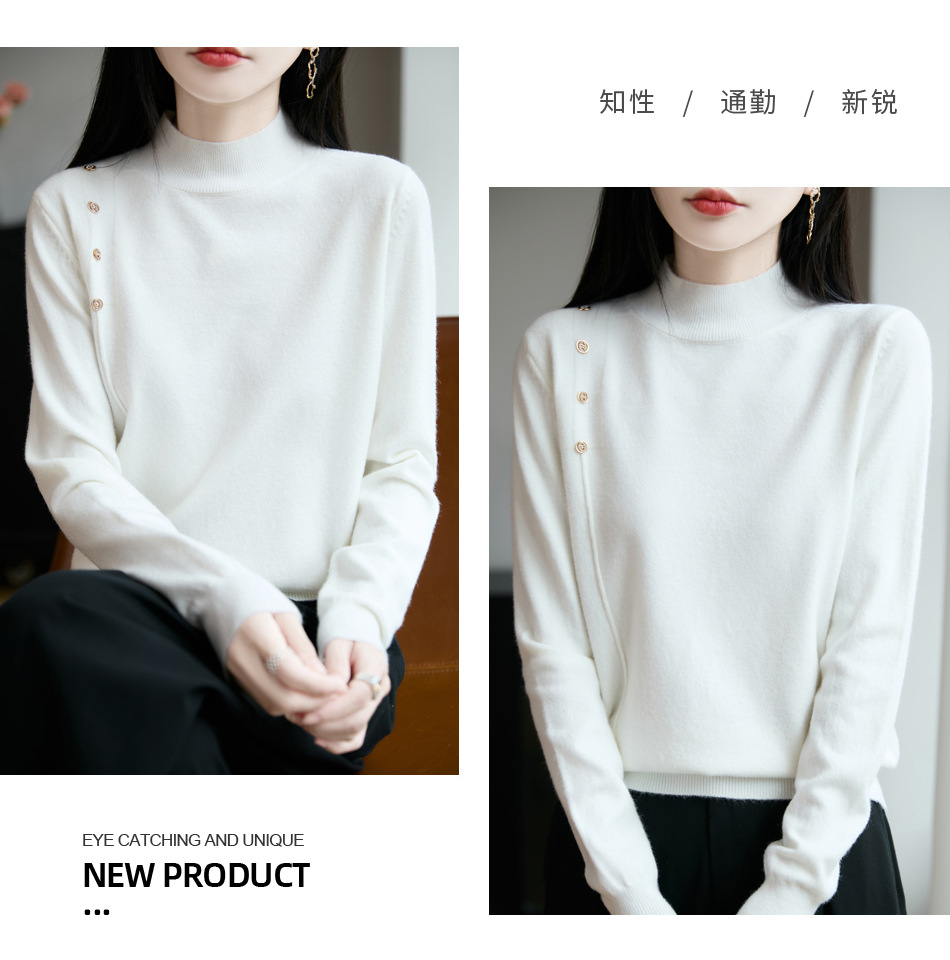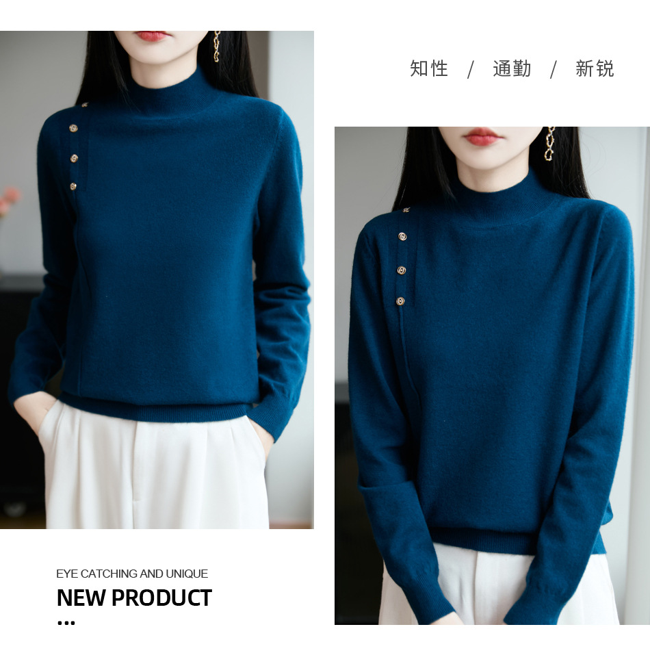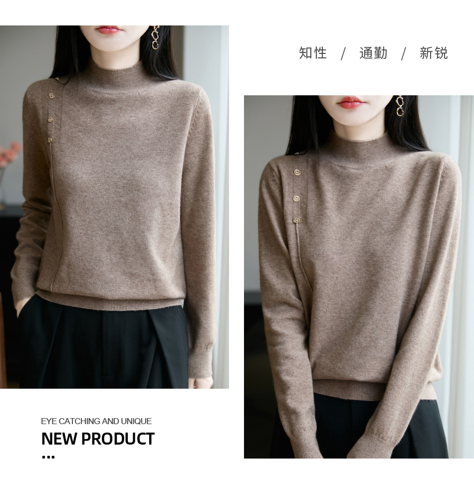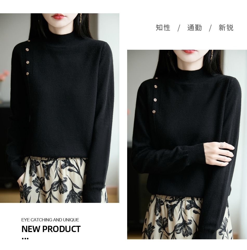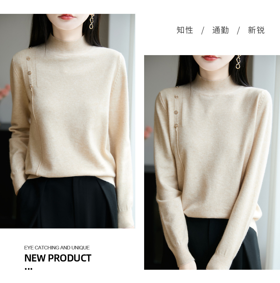 2025新款秋冬半高领打底衫纽扣毛衣女宽松外穿针织上衣洋气毛衣
