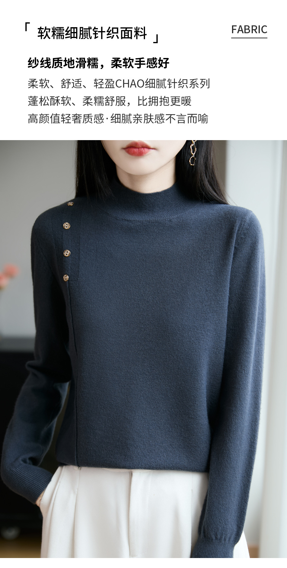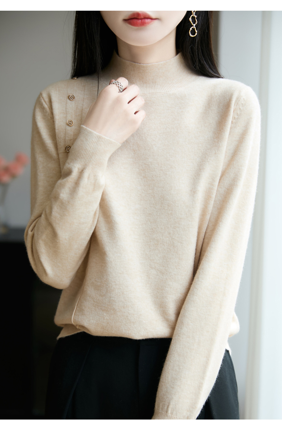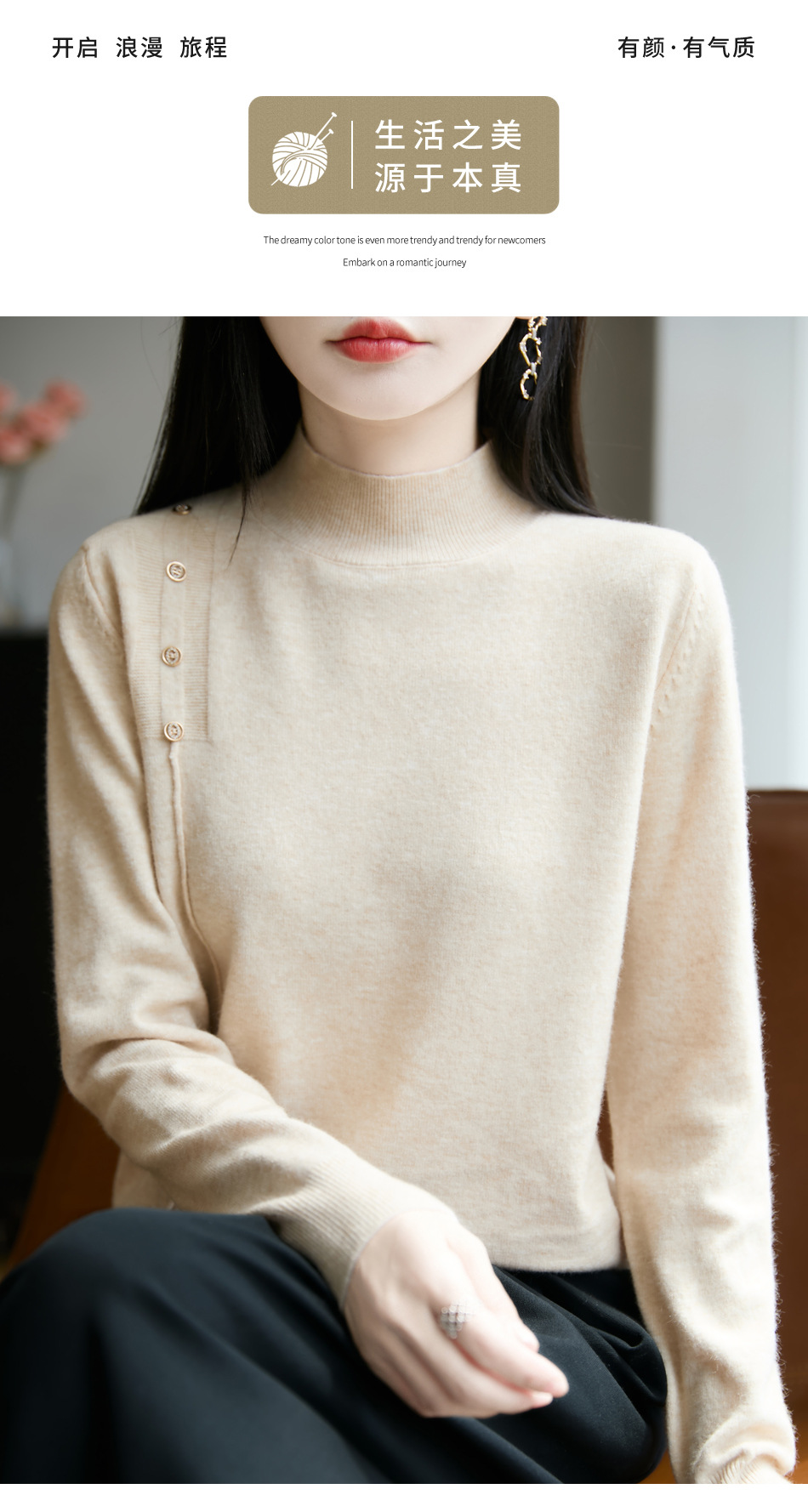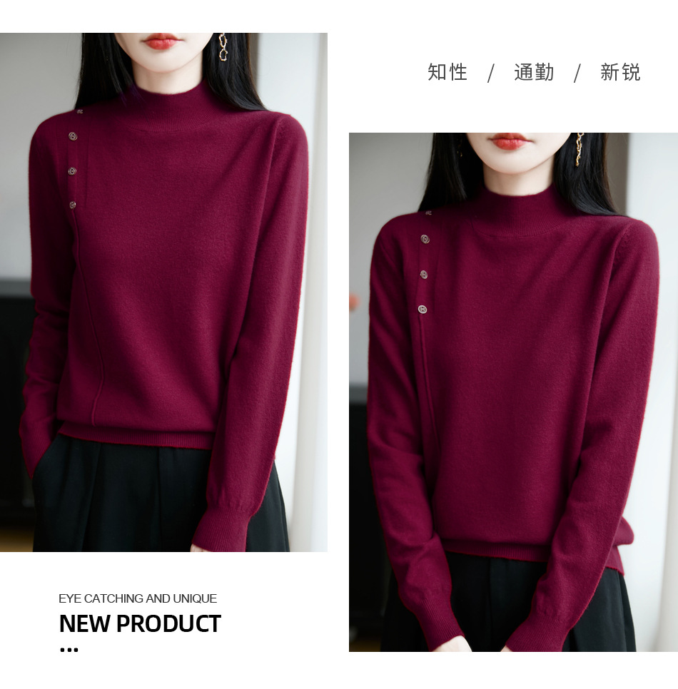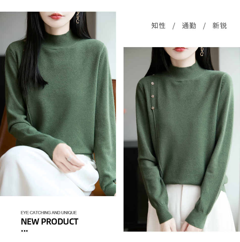 2025新款秋冬半高领打底衫纽扣毛衣女宽松外穿针织上衣洋气毛衣