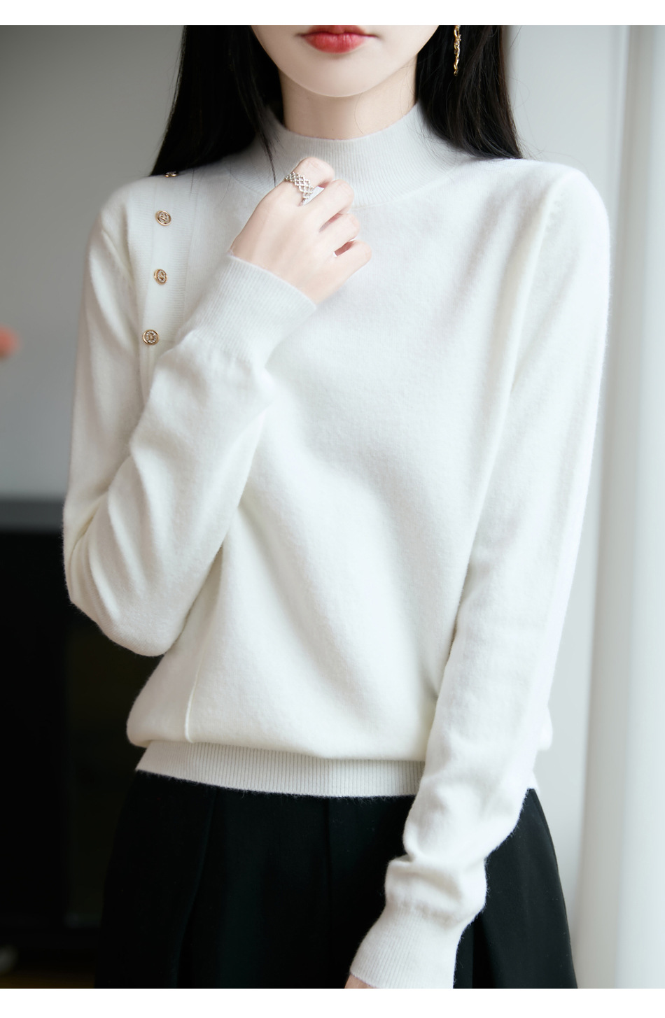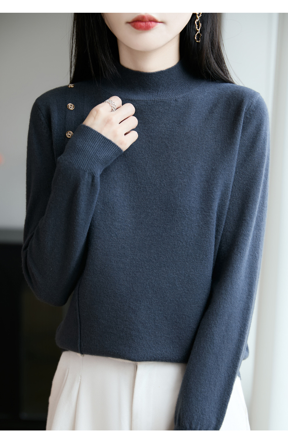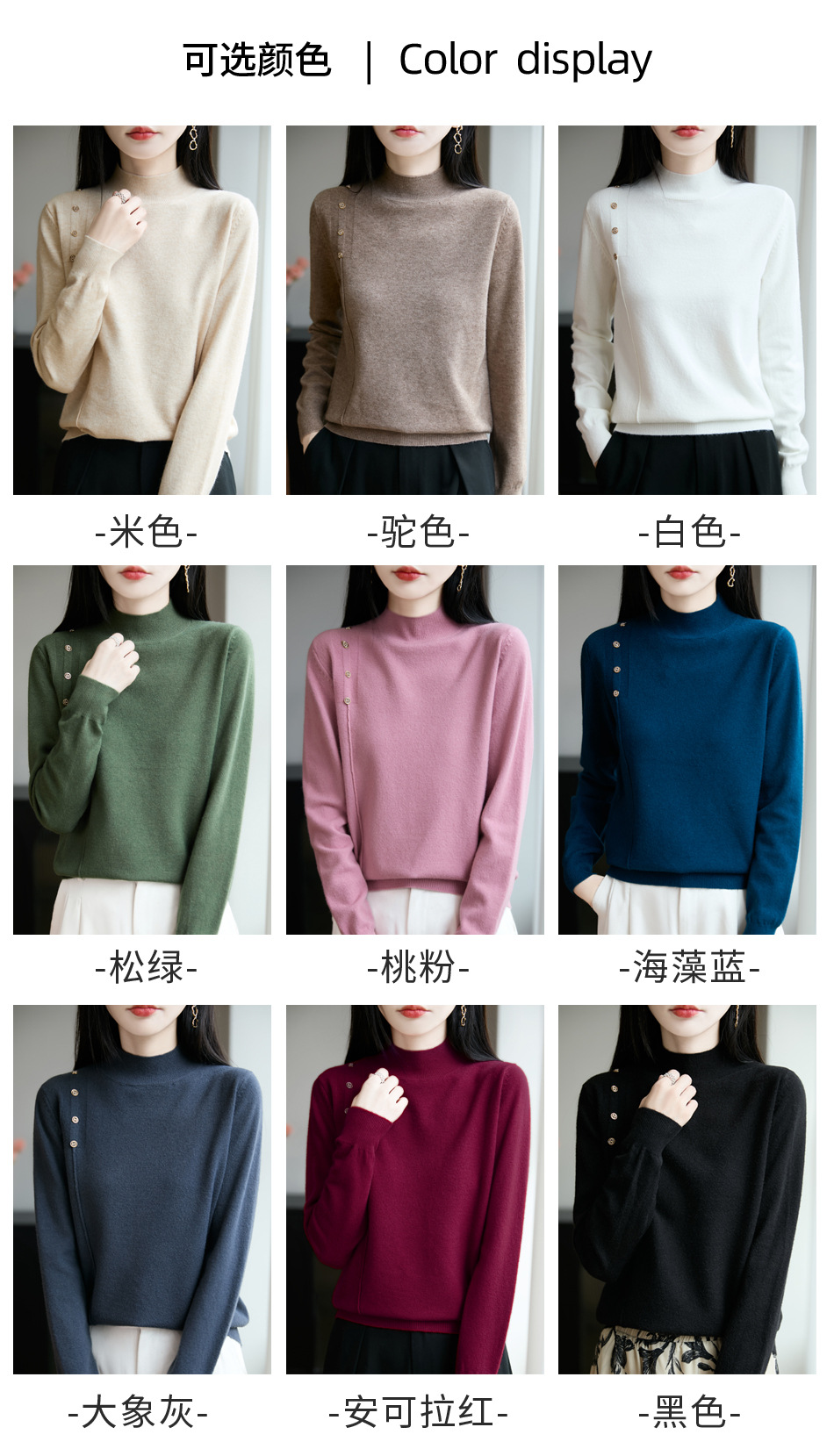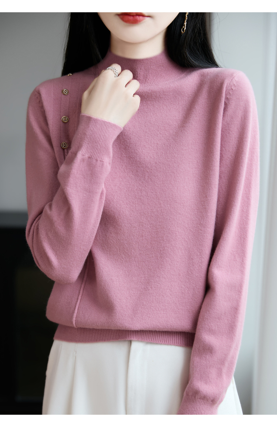 2025新款秋冬半高领打底衫纽扣毛衣女宽松外穿针织上衣洋气毛衣