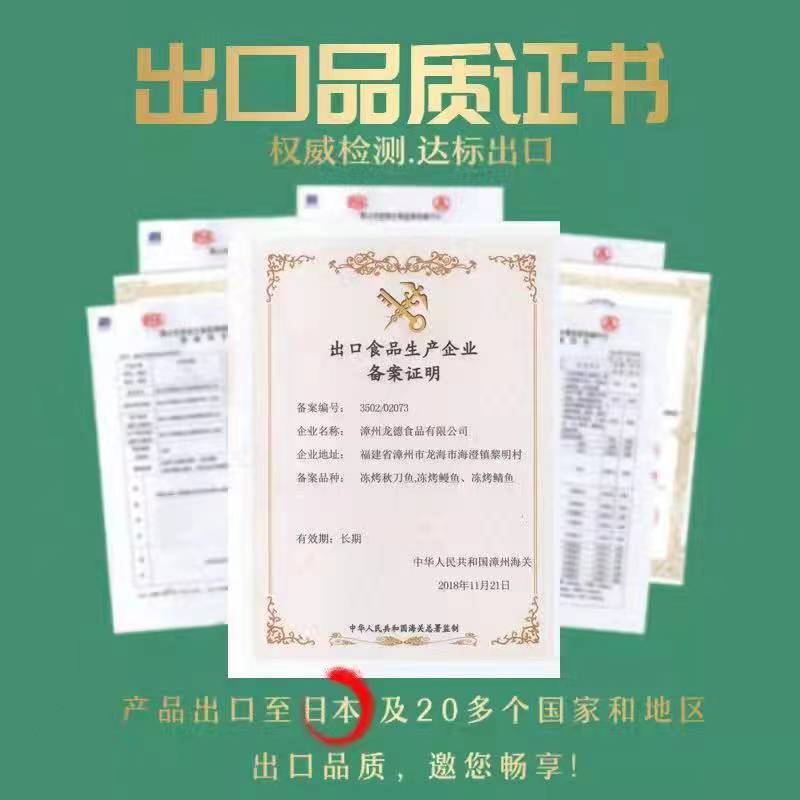 龙德食品,产品出口至日本及20多个国家及地区,出口的品质!极高的生产标准!我们的盐烤鲭鱼配料表非常的干净,只有鲭鱼、盐其他没有了!