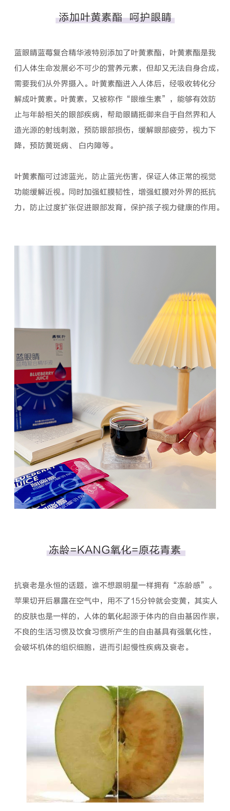 Q: 蓝眼睛蓝莓复合精华液保护视力原理 A: 一修复损伤,二营养保护。 叶黄素脂和野生蓝莓花青素是目前医学界发现的唯二可以直达眼底的视觉营养元素。 促进眼部血液循环、调节眼轴长度、促进视红素再生、改善黄斑恢复功能、降低眼压、保护眼角膜和视神经、增加泪液分泌、滋润眼睛。