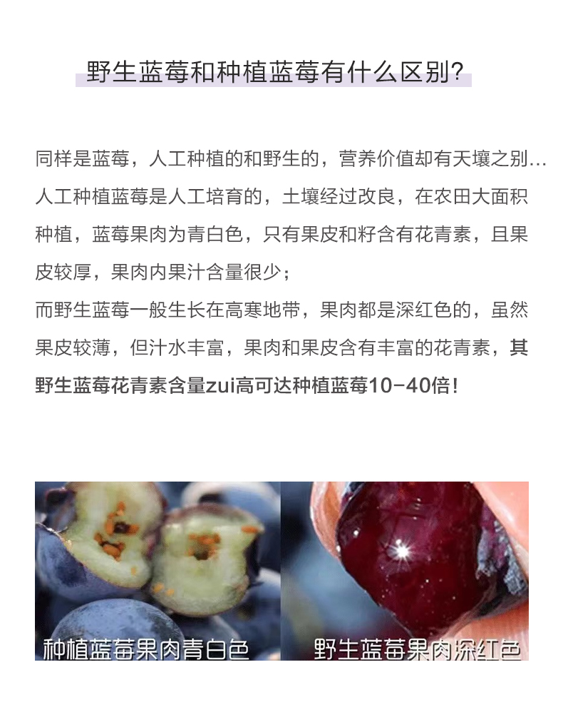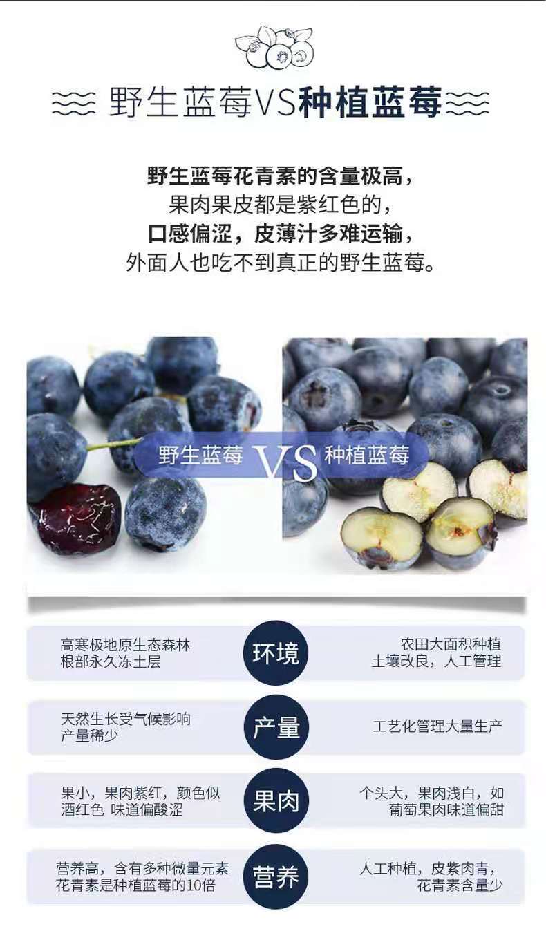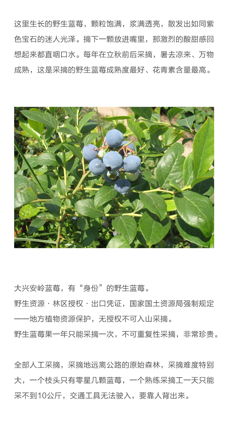 A:①纯野生,绝无种植,是目前少数不可人工培育的蓝莓品种之一,不可复制; ②全球90%的野生蓝莓集中在大兴安岭,想吃野生的只能在大兴安岭; ③果实小、紫色、果型小、紫心、成熟期一致、花青素含量高; ④野生蓝莓的花色苷是种植蓝莓的5-20倍; ⑤成熟期晚,8月开始,每年8月8日,是大兴安岭的蓝莓节; ⑥长在冻土层上的神奇浆果,在冻土层上10cm生长,耐高寒; ⑦长在沼泽地里和苔藓丛上; ⑧无土生长,无主跟,只有毛根。