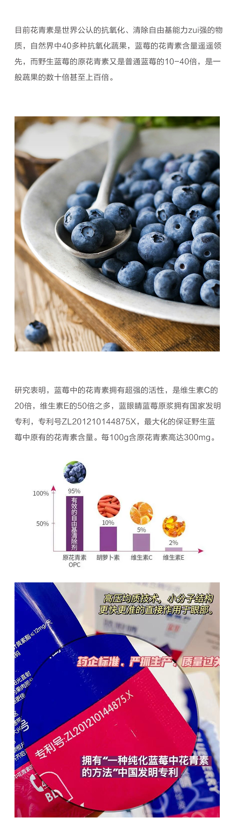 A: ①选用大兴安岭野生蓝莓 ②加入叶黄素酯 ③拥有“一种纯化蓝莓中花青素的方法”中国发明专利 ④企业获得GMP(质量管理体系)认证认证,用制药的标准做食品。 ⑤高压均质技术,小分子结构,更快更准的直接作用于眼部。
