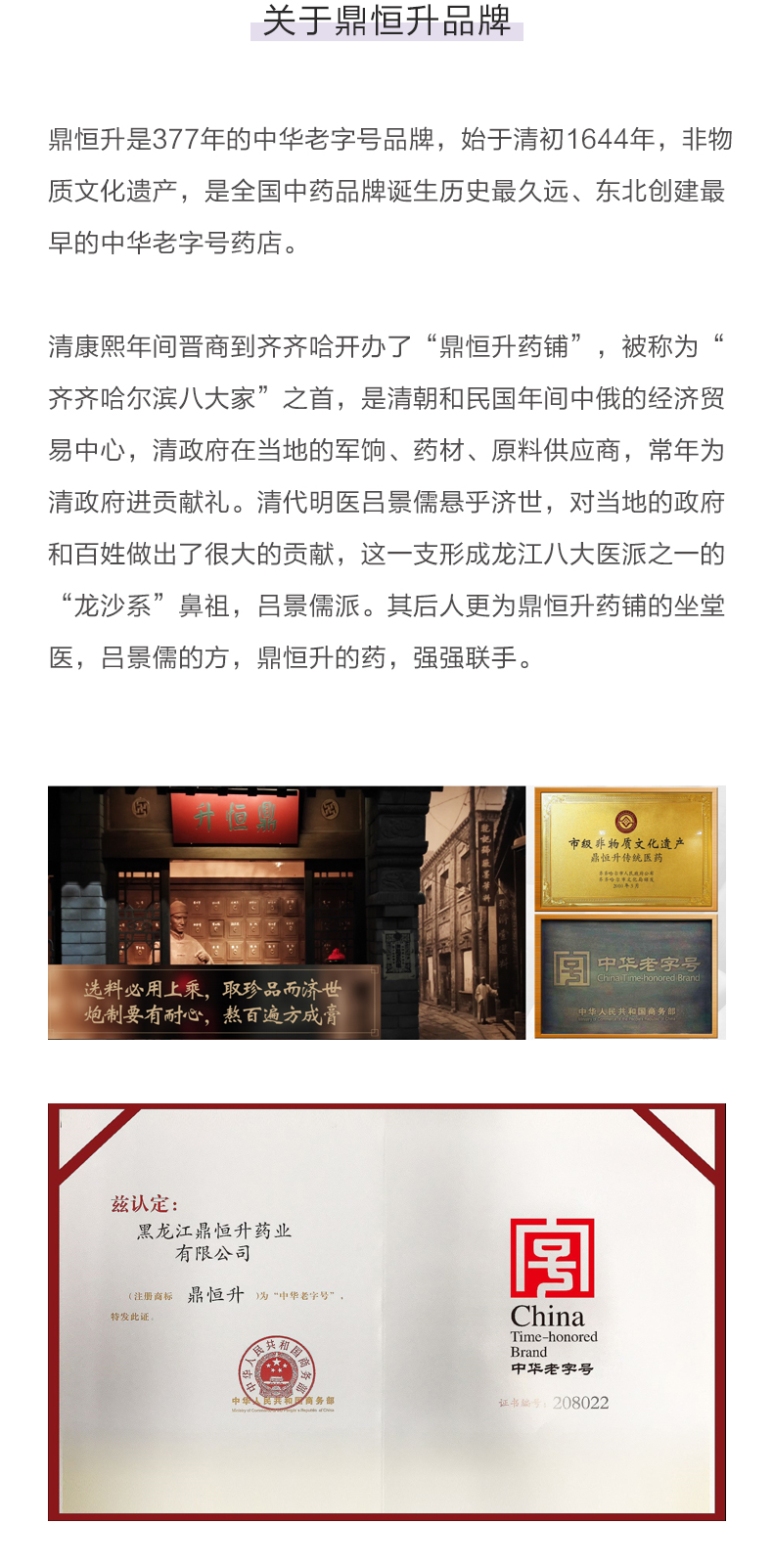 A: 鼎恒升始于清初1644年,具有377年历史的中华老字号品牌,非物质文化遗产。是全国中药品牌诞生历史最久远、东北创建最早的中华老字号药店。 《黑龙江省地方志》、《齐齐哈尔地方志》均有记载,清康熙年间晋商到齐齐哈开办了“鼎恒升药铺”,被称为“齐齐哈尔滨八大家”之首,是清朝和民国年间中俄的经济贸易中心,清政府在当地的军饷、药材、原料供应商,常年为清政府进贡献礼。清代明医吕景儒为龙江八大医派的“龙沙系”鼻祖,其后人更为鼎恒升药铺的坐堂医,吕景儒的方,鼎恒升的药,强强联手,至今在齐齐哈尔还有“吕氏宗祠”故居。