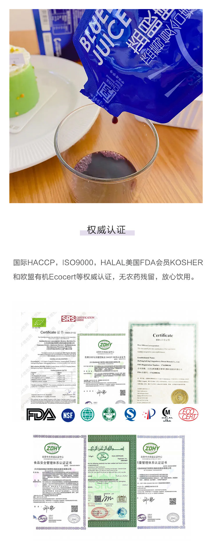 A: 这是国家规定,国家在原食品原料里面只有蓝莓。国家对食品原料有规定的,野生蓝莓是蓝莓,种植蓝莓是蓝莓,这是植物科属亚科分类的问题,不论是用野生种植的蓝莓,在原料上都是蓝莓,他没有继续细分野生蓝莓,种植蓝莓这样的,所以在配料表里面儿只能写蓝莓。 实际用料是采用的大兴安岭原料产地的野生蓝莓,大兴安岭的野生蓝莓必须是有资质才可以采摘,鼎恒升是有大兴安岭林业局授权进行野生蓝莓采摘的资质。