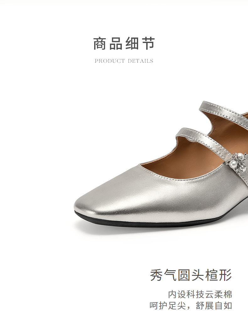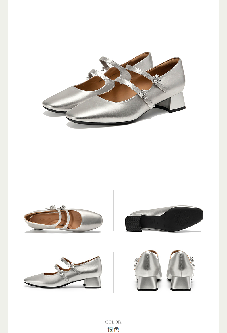 natursun银色玛丽珍鞋女优雅气质小羊皮高跟粗跟单鞋N25190205