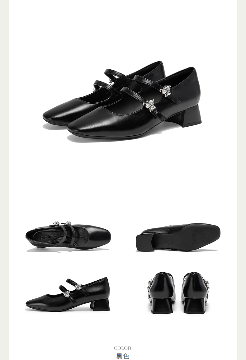 【静音系列】千百度粗高跟鞋女款褶皱羊皮玛丽珍鞋A25184506