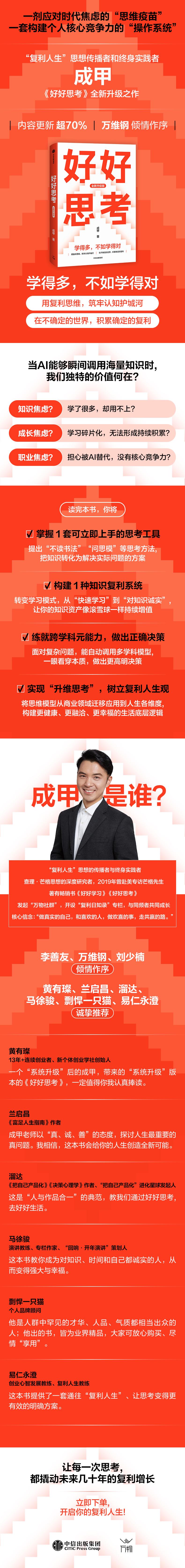 当AI能够瞬间调用人类所有知识时,我们独特的价值何在? 《好好思考》(全新升级版)给出了有力的回答:我们的核心竞争力,在于提出深刻问题的能力、跨学科整合的洞察力,以及构建思维框架的“元能力”。 成甲将查理·芒格的智慧进行本土化与时代化改造,创造出以“复利人生”为核心的成长哲学。书中不仅教会我们如何用多元思维模型分析问题,更指引我们将这种思维方式迁移到健康、人际往来与事业中,建立可持续的竞争优势。 这本书是献给所有终身学习者的一份礼物,帮助我们在快速变化的世界中,拥有笃定而强大的内在力量。