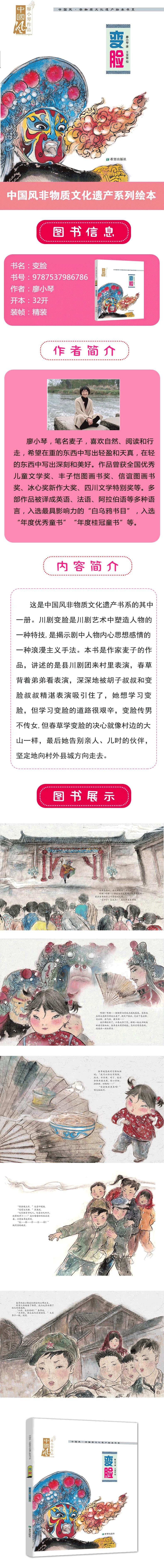 《变脸》是中国风非物质文化遗产书系的其中一册。川剧是全国首批非物质文化遗产保护项目。变脸只是川剧这个剧种的一个绝活。这个绘本故事是作家廖小琴,笔名麦子的作品,讲述的是县川剧团来村里表演,春草背着弟弟看表演,深深地被胡子叔叔和变脸叔叔精湛表演吸引住了,她想学习变脸,但学习变脸的而道路很艰辛,变脸穿男不穿女,但春草的学变脸的决心就像村边的大山一样,最后她告别亲人、儿时的儿时的小伙伴,向村外的县城方向走去。