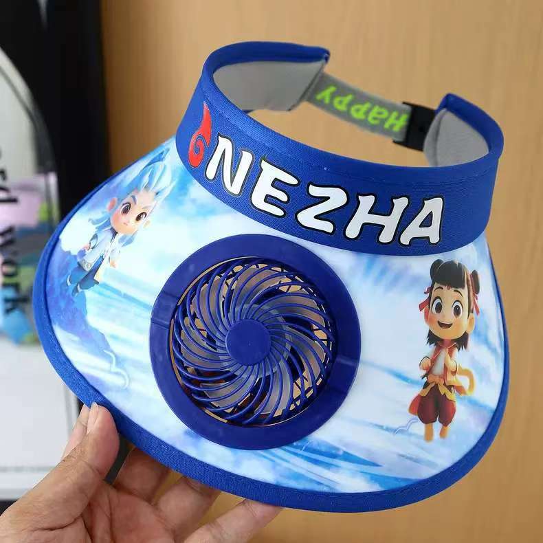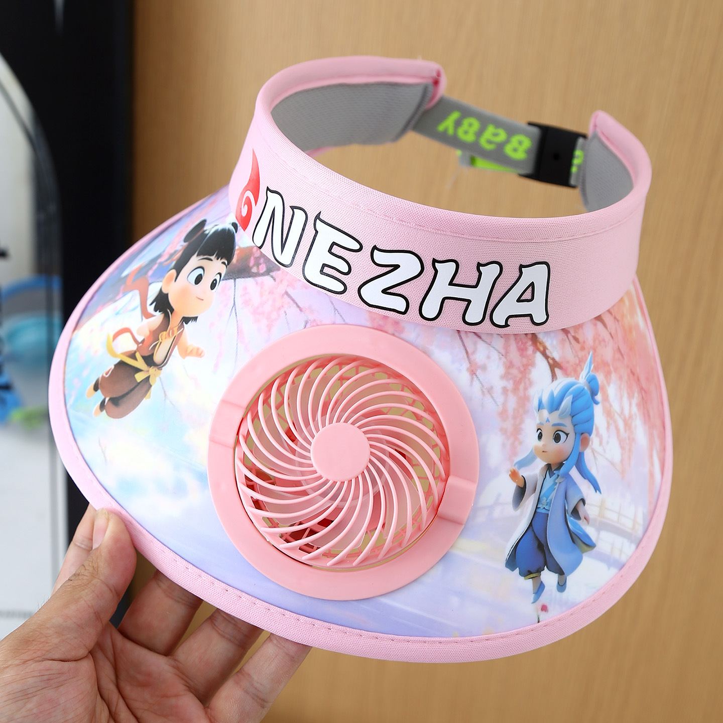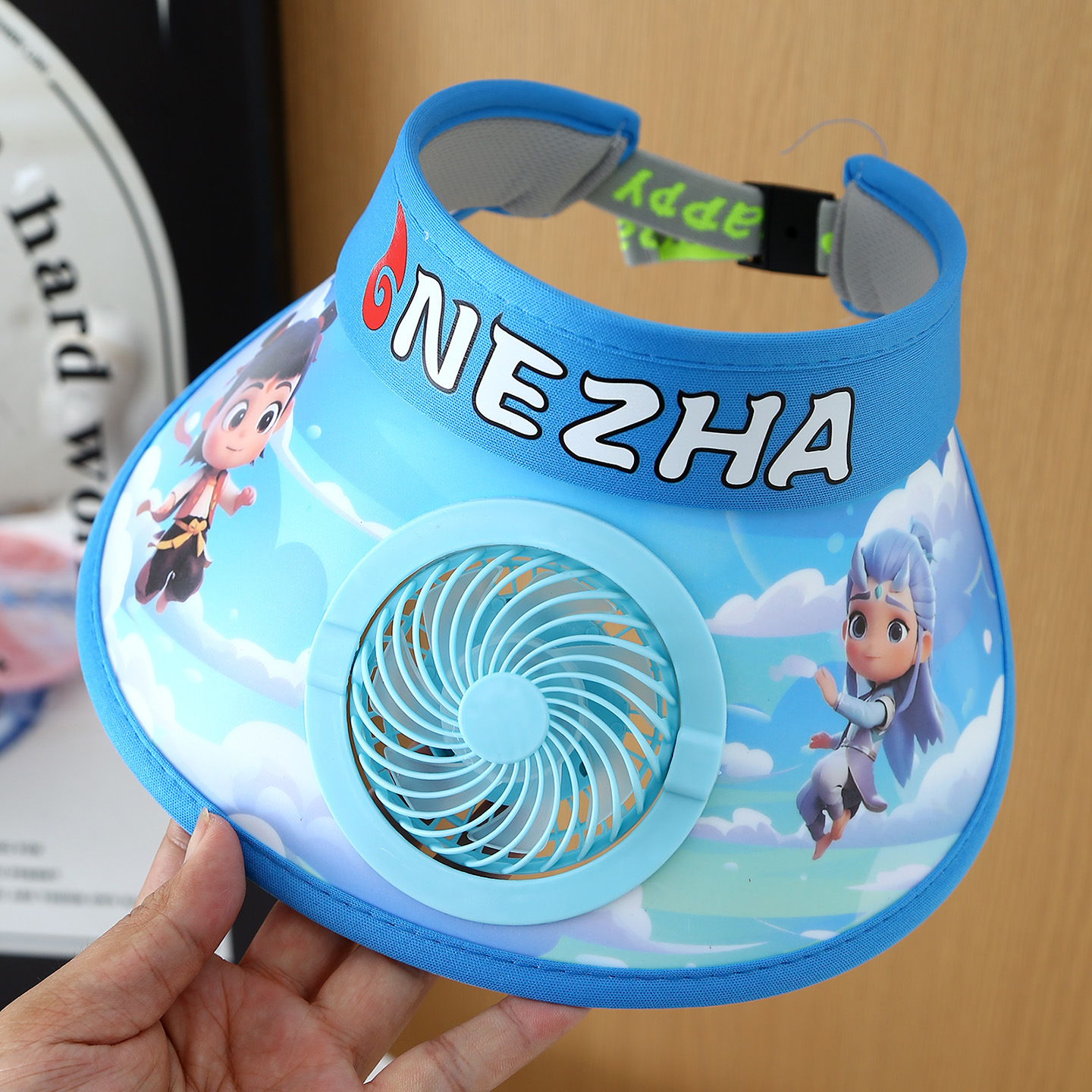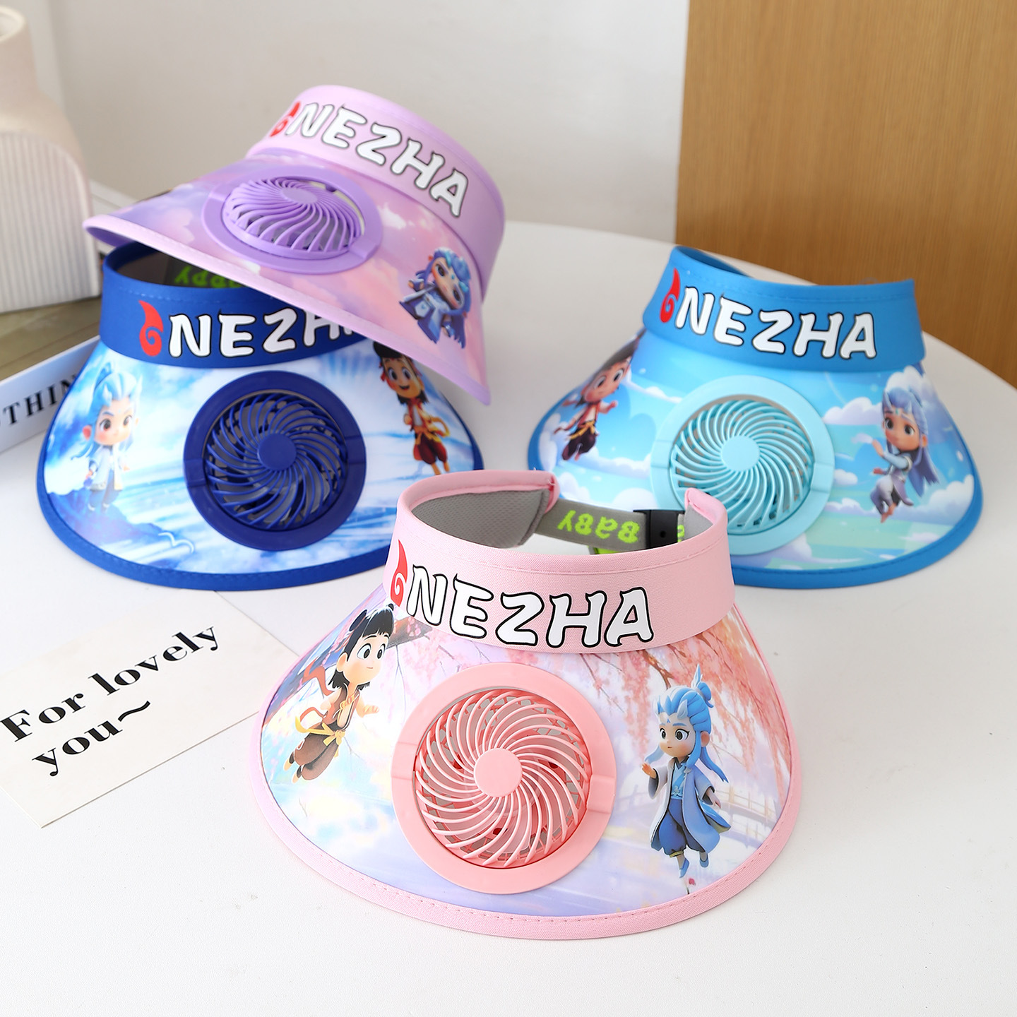 【卡通遮阳帽❗️带风扇】夏季儿童带风扇遮阳帽空顶帽宝宝帽子卡通哪吒防晒女童太阳帽。ya