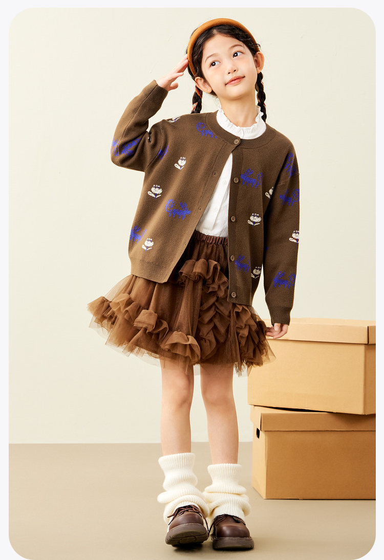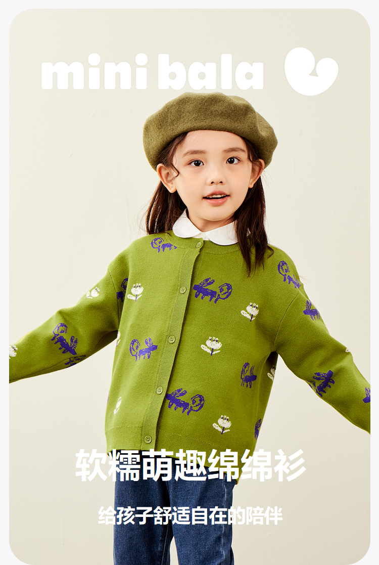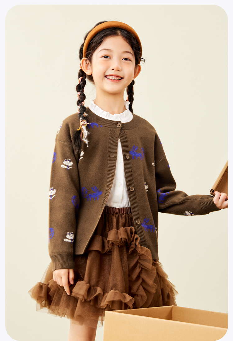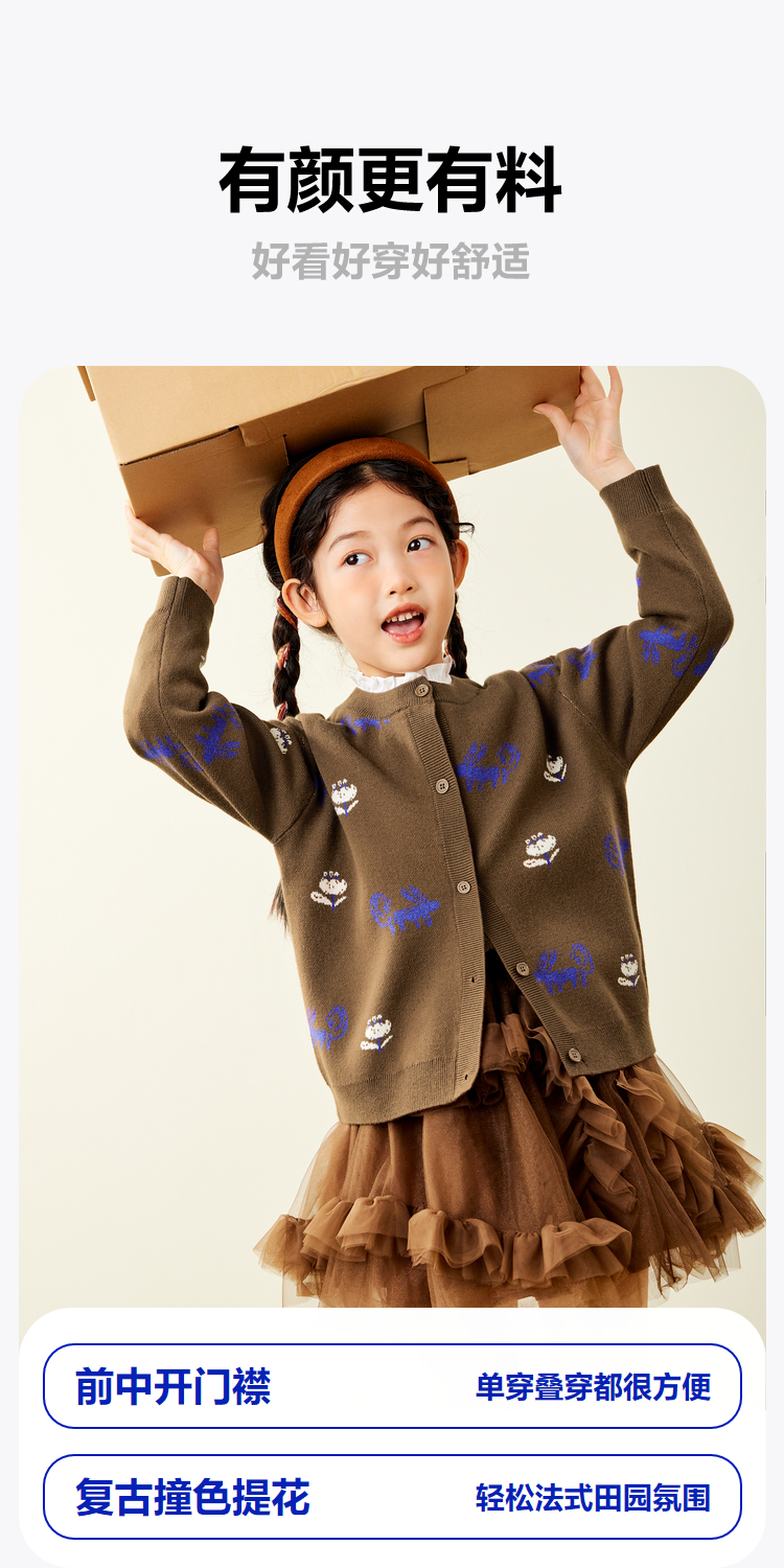 迷你巴拉女童儿童针织开衫秋季复古撞色提花毛衫