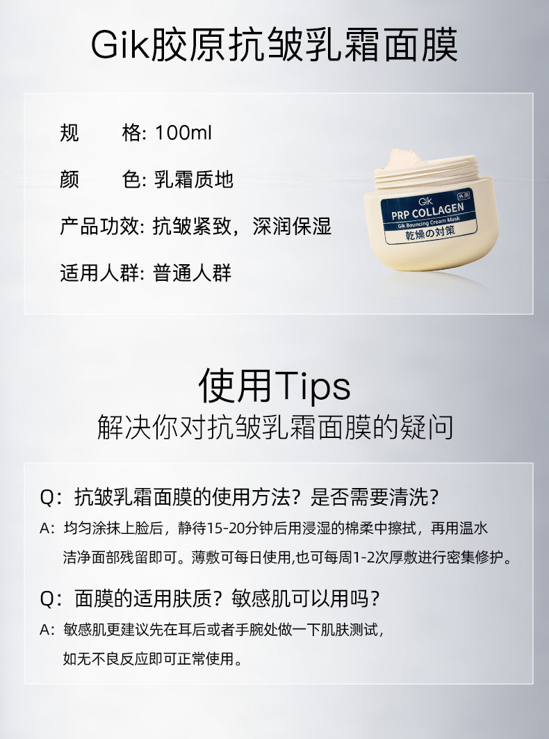 【爆款超低价预售 急单慎拍】GIK胶原抗皱乳霜面膜保湿滋润紧致面膜嫩肤涂抹式亮肤面霜